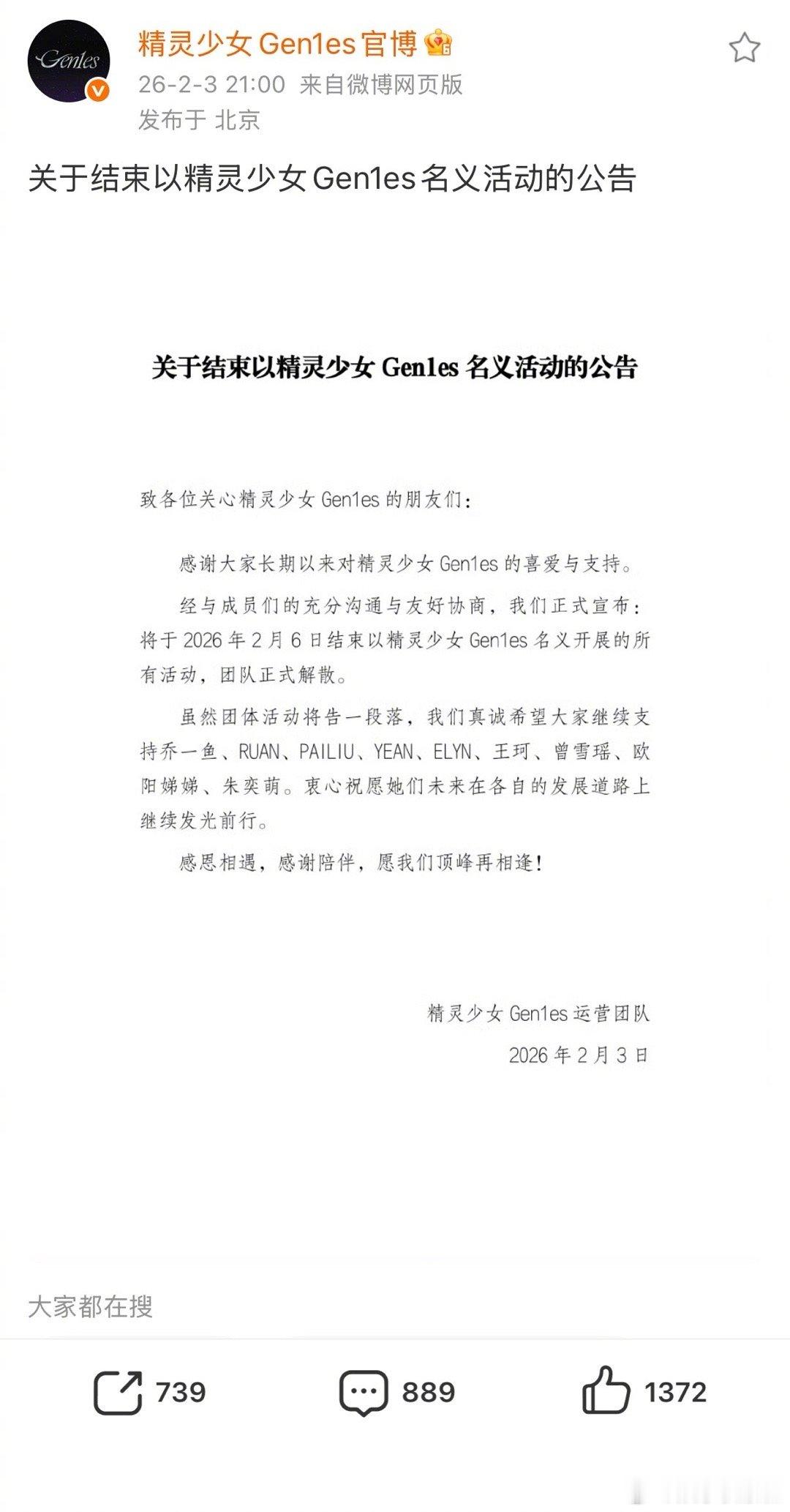 精灵少女官宣解散 感谢相遇,不负并肩🙏这段属于 Gen1es的时光,有热血、有
