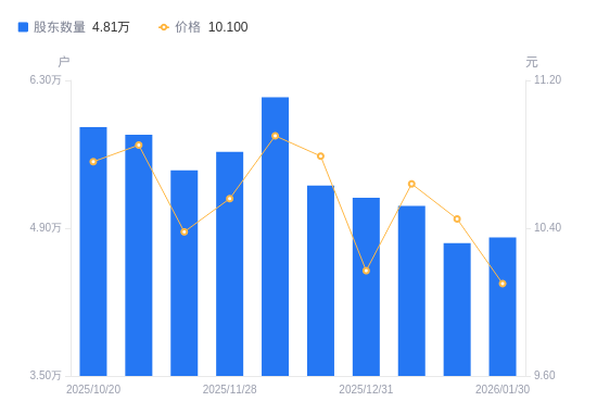日期A股户数(户)流通A股户均持股数(股)户均持股市值(万元)2026-01-304812913837.8113.982026-01-204759513993.0714.622026-01-095110213032.7613.872025-12-315188312836.5713.052025-12-195304512555.3813.552025-12-106141510844.2611.822025-11-285624411841.2612.502025-11-205449312221.7512.692025-10-315784311513.9312.492025-10-205858211368.6812.23