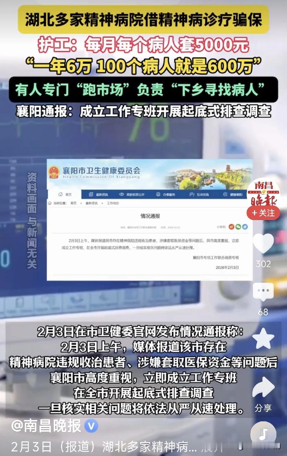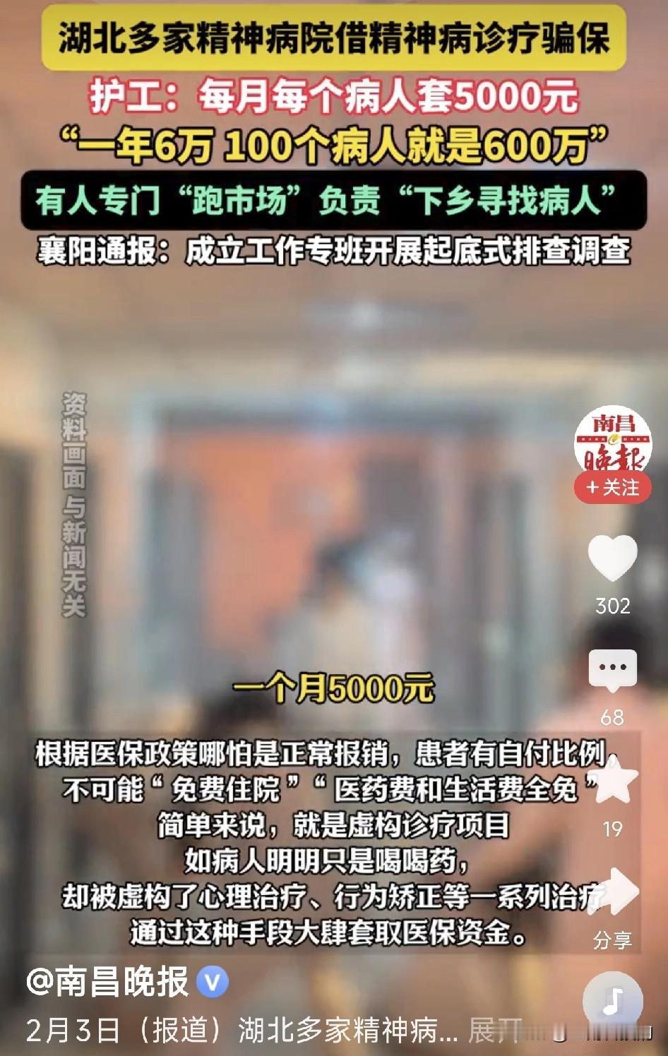 太可怕了!这哪是医院,分明是吃人的“医保印钞机”! 最近,有新京报记者卧底调查,揭露了湖北襄阳、宜昌两地多家精神病医院骗保内幕,看得我脊背发凉。这些医院打着“免费住院、免费接送”的旗号,专门下乡拉人。只要你愿意去,管你是想戒酒、混口饭吃,还是单纯想找个地方养老,全都收进去当“病人”。 更离谱的是,连自己医院的护工、保安都得办住院手续,凑人头套医保。护工都亲口说了,每个病人每月能套5000块,一年就是6万,100个病人就是600万!院长开着百万豪车,赚的全是咱们普通人的救命钱。 进去之后,你就不是你了。不听话就打骂捆绑,想出院比登天还难。这还是治病救人的医院吗?分明是个把人关起来榨干价值的黑监狱! 最让我寒心的,不是这些医院的黑心,而是他们把医保当成了“提款机”。精神病院封闭管理的特殊性,让这里成了监管盲区。如果不是记者卧底曝光,不知道还有多少无辜的人被关在里面,不知道还有多少医保资金被卷走。 希望这次不光要把这些黑心医院连根拔起,更要补上监管的大窟窿,别再让救命钱变成某些人的盘中餐!