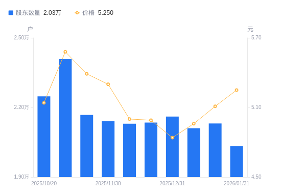 日期A股户数(户)流通A股户均持股数(股)户均持股市值(万元)2026-01-312034216100.798.452026-01-202131015369.417.852026-01-102110815516.507.702025-12-312161015156.057.342025-12-202134715342.787.662025-12-102130115375.917.692025-11-302141315295.498.112025-11-202168215105.728.142025-11-102409613592.397.582025-10-202247814570.797.49