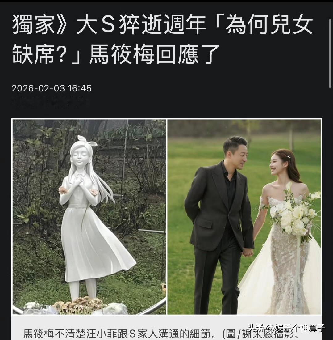 马筱梅回应大S儿女缺席雕像揭幕仪式! 2月3日,据媒体报道,马筱梅在接受采访时,回应了大S儿女缺席雕像揭幕仪式,看完内容,不得不说,回答的很有水平。 本人不才,仔细推敲,感觉马筱梅什么也没说,又好像什么都说了。 透露孩子放寒假隔天就回家了,这……,顾名思义,小玥儿和小霖霖都有时间,就跑去了,也不会耽误学习。 还表示,不知道两家人怎么沟通的,我只负责照顾孩子,言外之意,不了解情况,也不掺和这些事,直接推得一干二净。 确实,一对儿女缺席,网友都觉得不妥,大S逝世一周年,生前最牵挂,最想看到人却没有到场,有点说不过去。 这里无非两个问题,S家是否进行了通知和邀请,汪家是否同意孩子前往。 话说,这个时候,就算存在个人恩怨,大是大非面前,应该也不会计较。 至于到底什么原因?不得而知,咱也不好妄自猜测。 换个角度想想,儿女缺席,却有遗憾,不过,也免得看到妈妈的雕像而难过,幼小的心灵,可能很难承受。 不管怎么,这都是人家的家务事,作为路人,没必要太较真。 另外,不得不吐槽一下,台媒这个配图,可真能整活,看热闹不怕事大呀!