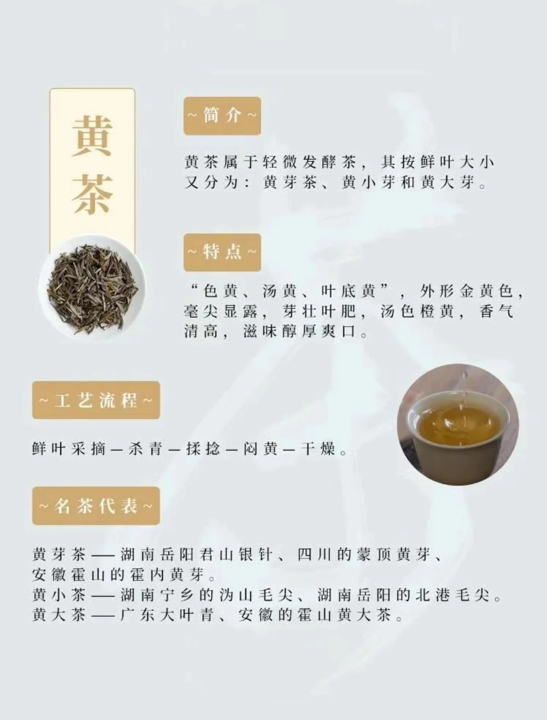 黄茶的独特之处在于“闷黄”工艺,使茶叶在湿热作用下发酵变黄。其品质特征为“黄叶黄汤”,滋味醇和回甘。蒙顶黄芽是黄茶的代表之一,外形扁直,芽头肥壮,色泽黄润,汤色黄绿明亮,香气清纯,滋味醇厚;君山银针外形挺直似针,芽头金黄,汤色浅黄明亮,香气清雅,滋味甘甜。