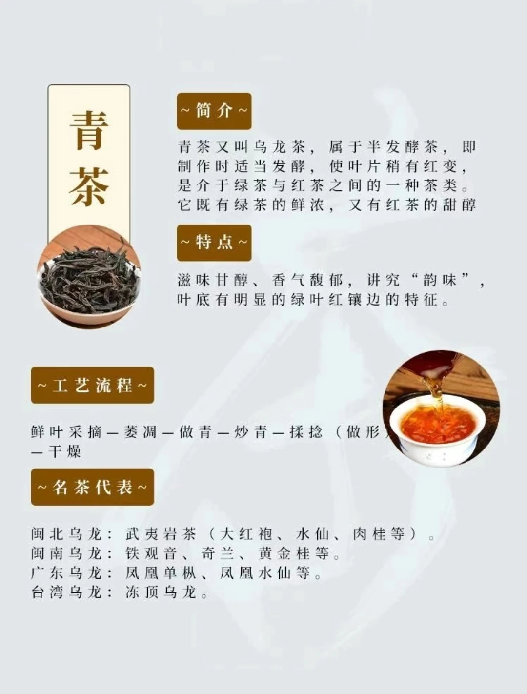 青茶,即乌龙茶,发酵程度在绿茶和红茶之间,兼具两者的香气特点。其制作工艺复杂,包括萎凋、做青、炒青、揉捻和烘焙。做青是关键步骤,通过摇青和晾青交替进行,使茶叶边缘细胞受损,形成“绿叶红镶边”的独特外观和馥郁香气。