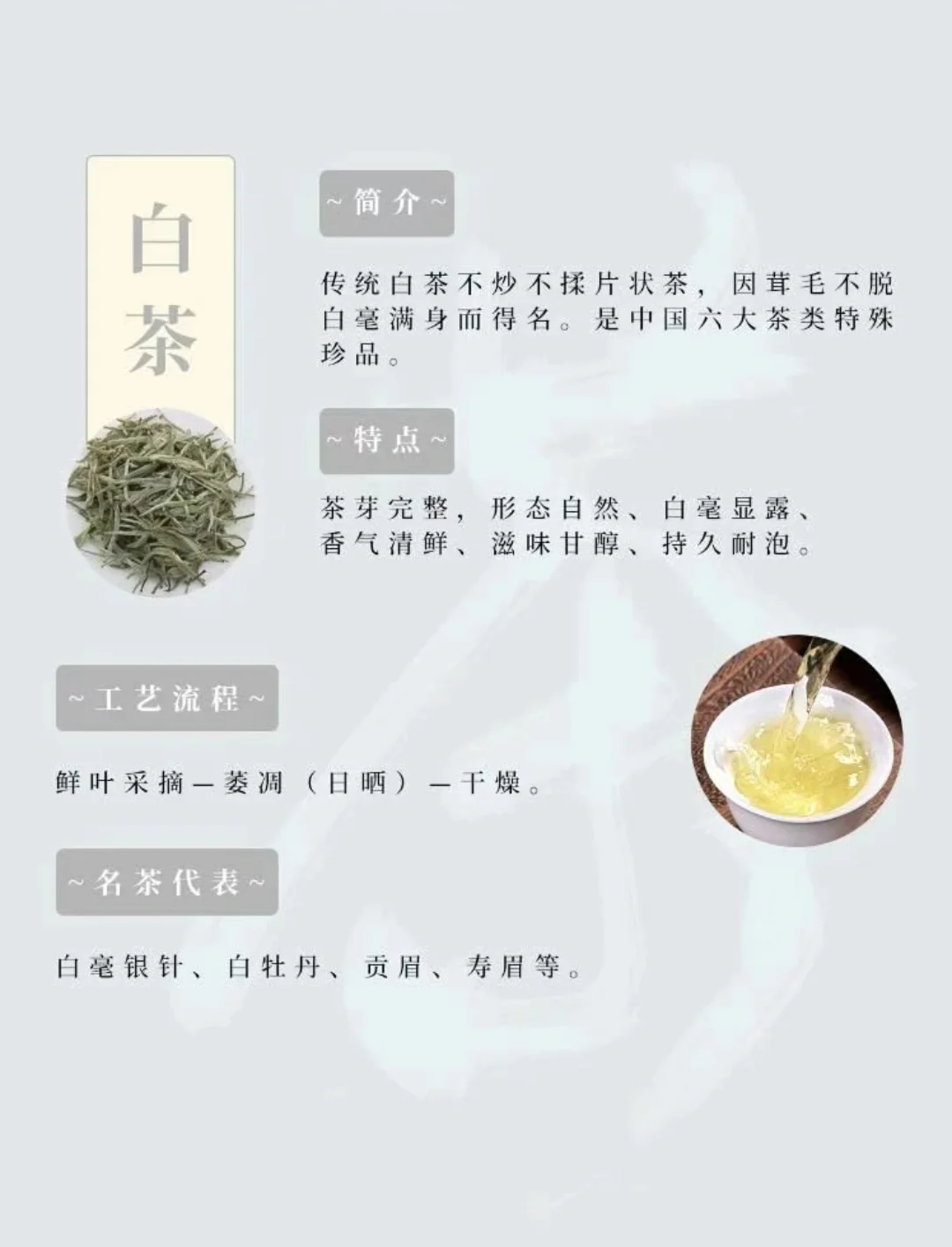 白茶的制作工艺简单,主要为萎凋和干燥,几乎不进行发酵。其特点是保留了茶叶的原始形态和营养成分,以“芽头肥壮、满披白毫”为佳。白毫银针是白茶中的珍品,外形似银针,白毫密被,汤色浅杏黄,滋味清甜;白牡丹则叶片开展,绿叶夹银毫,汤色杏黄明亮,香气清新,滋味醇和。