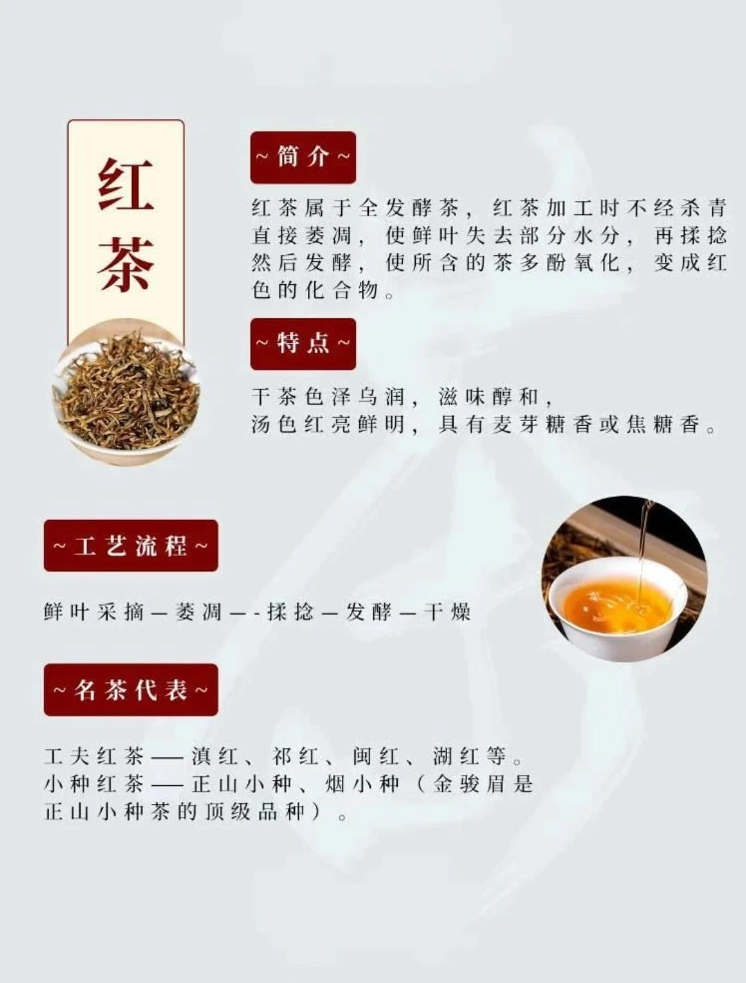 红茶是全发酵茶,制作工艺包括萎凋、揉捻、发酵和干燥。发酵过程中,茶叶中的多酚类物质氧化,使茶汤呈现红艳色泽。