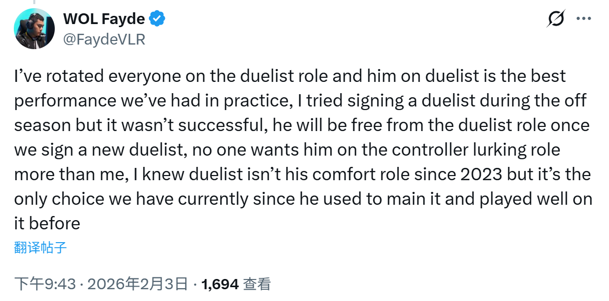 没有人比我更希望他去玩烟去单摸。我知道从2023年开始,决斗就不是他舒适的位置,但这是我们目前唯一的选择,因为他以前主玩这个位置,而且打得很好。"