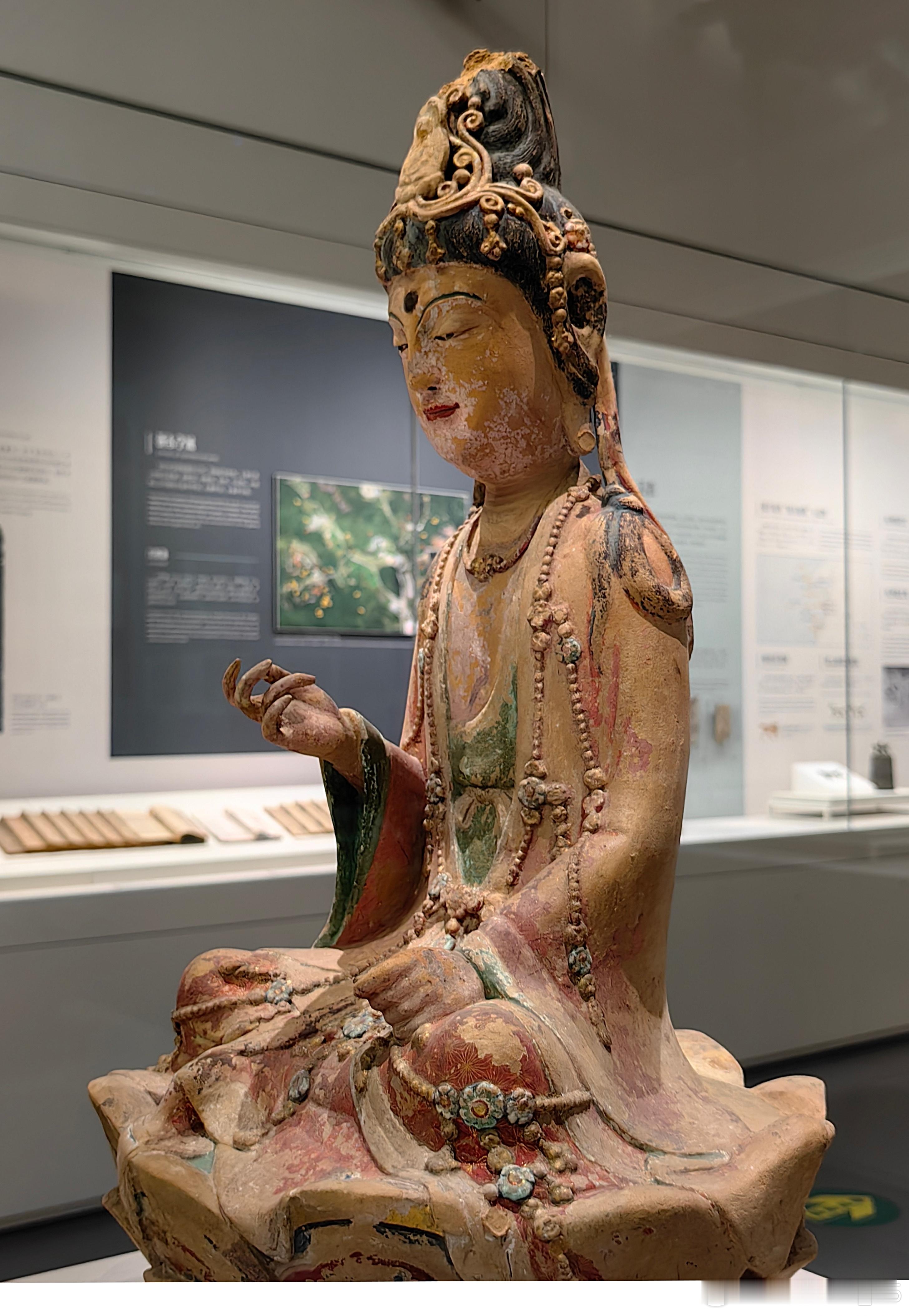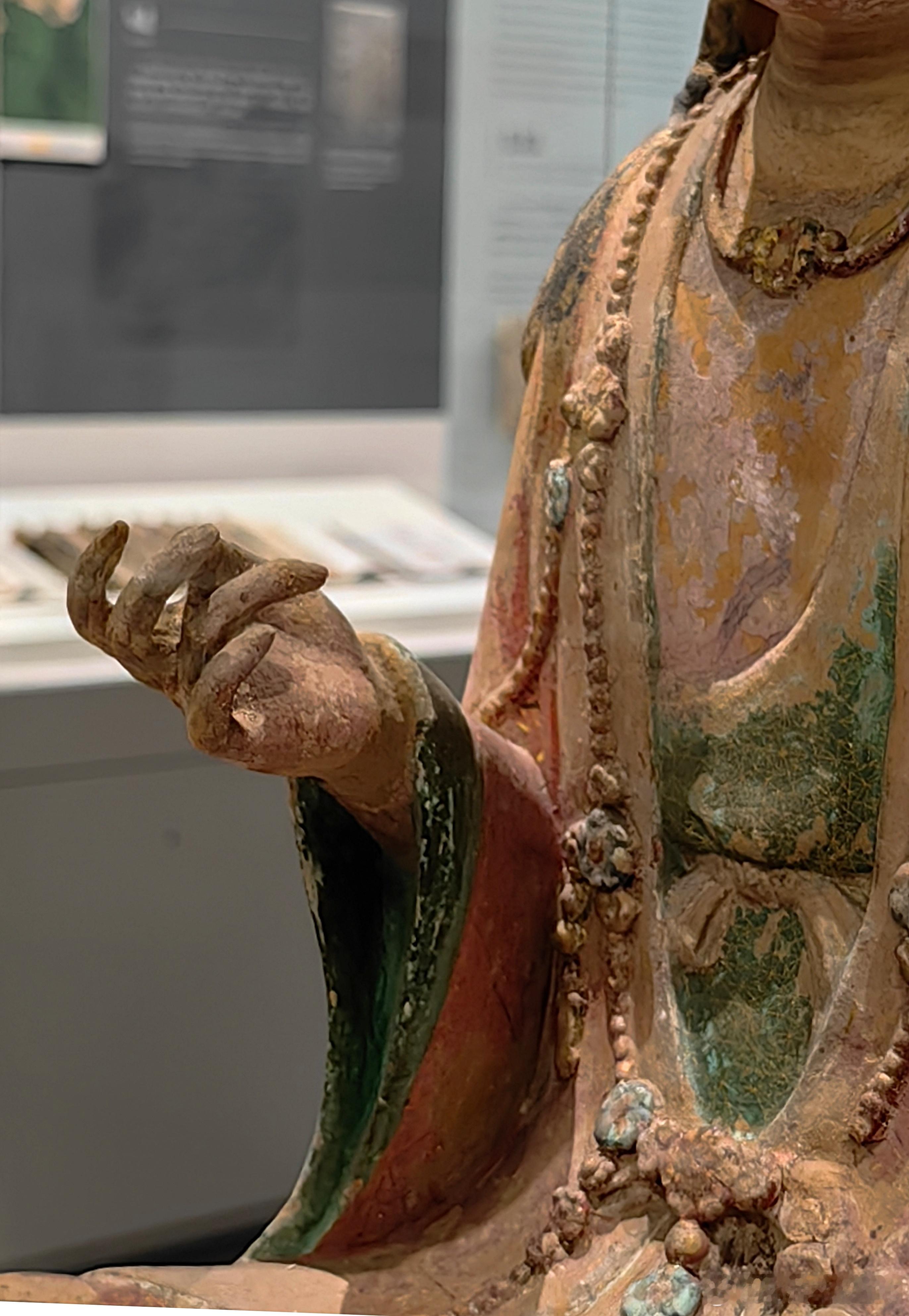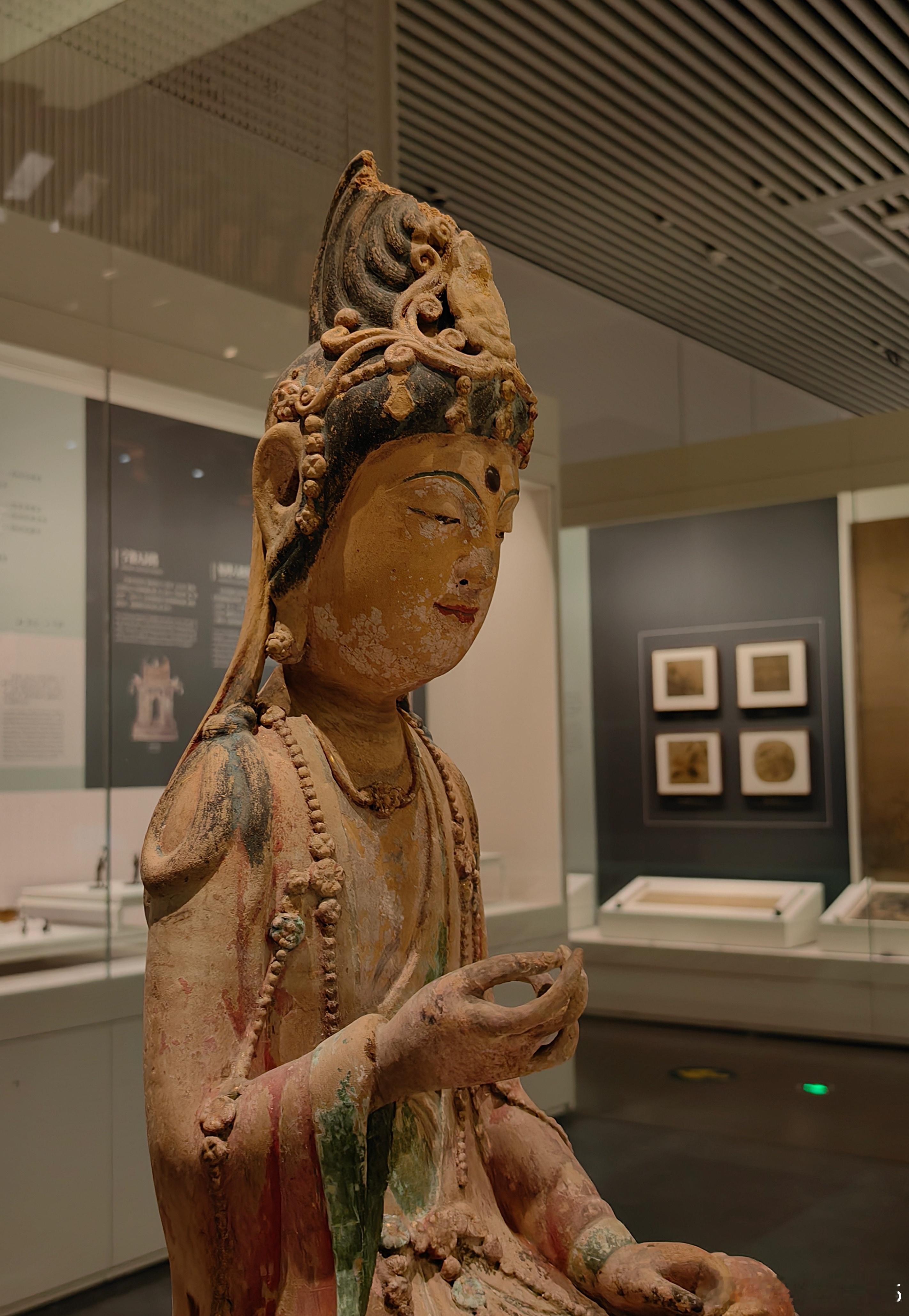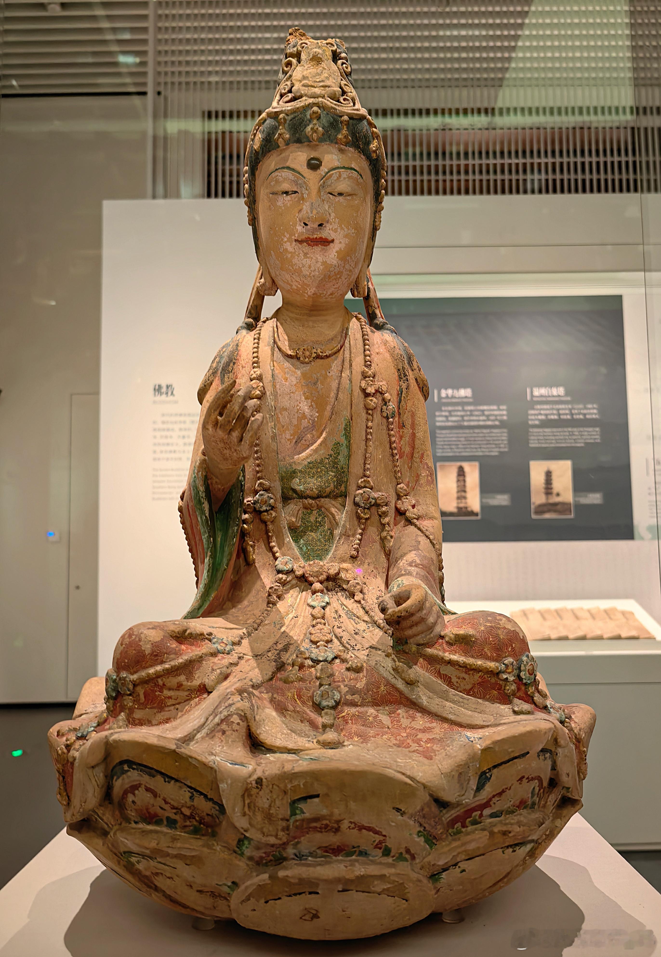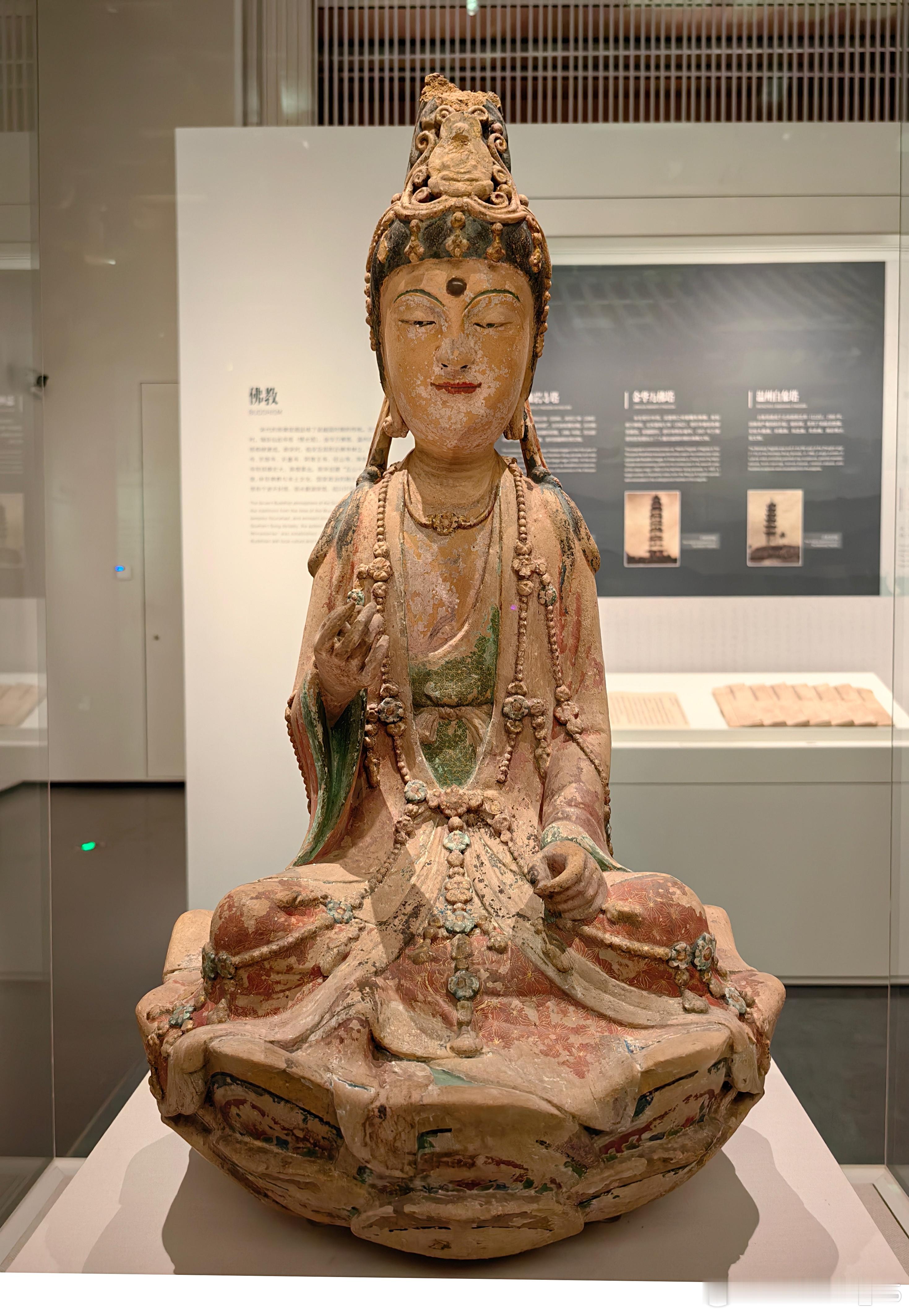 彩塑泥观音菩萨坐像北宋(960-1127)浙江省博物馆藏1965 年在浙江温州白象塔的拆除过程中被发现。观音呈结跏趺坐姿态,端坐于仰莲座上。头戴高冠,面容秀丽,双目微垂,流露出宁静慈祥的神情。像身保留了红、绿、黑等多种彩绘痕迹,虽历经千年仍依稀可见当年的绚丽。菩萨的头饰、璎珞等细节,都刻画得十分精美。约会博物馆文物