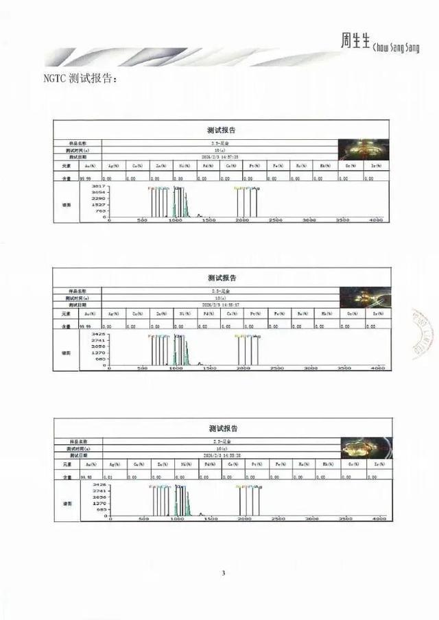 同时,今日2月3日,我司已将同批次同款福袋送检至国家珠宝玉石首饰检验集团有限公司(NGTC),采用X射线荧光光谱法(XRF)进行检测,该福袋货品的检测结论为足金饰品(报告编号:P-ZSSA2121621)。NGTC对该货品随机选取3个检测点,检测所得金含量结果依次为99.99%、99.99%、99.98%。