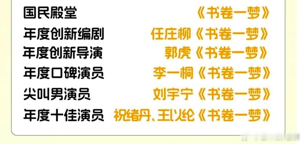 书卷一梦的权威我后知后觉。从主角到配角到幕后的导演编剧全都获奖,年底各大平台,年度热剧榜单评选 都在前十,真的全员上桌了