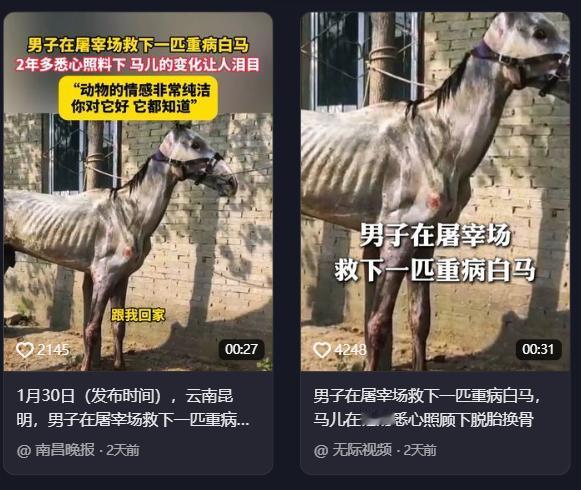 万物皆有灵!云南昆明,一匹病马原本要被主人宰掉,不料被好心人救下。他3个多月里,花费超10万元救治,结果从“灰”马变白马,让它脱胎换骨,尤其让人动容的是马儿对这份恩情的回报…… 昆明的一月,风里透着干冷。在这个农场的夕阳下,如果你路过,会看到极具冲击力的一幕:一匹通体雪白的骏马,温顺地把硕大的下巴搭在一个中年男人的大腿上,眼神比家养的金毛还要黏人。 但这并非什么田园牧歌式的名驹养成记。镜头拉远,这张温情画面的背后,叠加着一组冰冷得让人牙疼的数字:10万元医疗费、1万元“赎身金”、整整3个月的不眠不休,以及一张至今没还清的“欠债清单”。 2023年的那个救助日,这匹马还是一堆蜷缩在屠宰场角落的“废肉”。那时候不叫“石头”,也没有名字,只是一匹瘦了整整200斤、浑身毛发灰暗结块、皮肤溃烂的病畜。 在这个充斥着血腥味的交易场里,原本的主人把它当成负资产甩卖,屠宰场把它当成按斤称重的食材。唯有路过的丁力,于这眼神满是绝望的牲口跟前,止住了脚步。 他干了一件在旁人看来极其“愚钝”的事:掏出1万元,买断了这个注定要死的麻烦。这只是烧钱的开始。当兽医的一纸诊断书拍在桌上重度营养不良、慢性肺炎、寄生虫爆发、内外伤复合——没人看好这匹马能活。 兽医把丑话说是前头:治好它,起步价10万,周期至少三个月,成功率未知。周围的亲友几乎都在劝退:“有一万块买什么马不好?非要往水里扔?” 但丁力是个认死理的人。他没算那笔“投入产出比”的经济账,而是算了一笔生命账。为了这匹素昧平生的马,他掏空了积蓄,甚至硬着头皮背上了外债。 接下来的90天,是一场微观视角的生命重塑工程。没有奇迹发生,只有熬。每日凌晨五点,丁力准时起身。他将优质草料研磨成粉,兑入营养液,不用常规喂食方式,而是手持针管,小心翼翼地往马嘴里一点点“注食”。这一顿饭,就要喂一个小时。 为了防止马匹长期卧床长褥疮,他每隔4小时就得帮这几百斤的家伙翻一次身。每天20斤胡萝卜、10斤豆粕,那是雷打不动的标准。 转折点发生在第28天。当那匹瘫软的躯体第一次晃晃悠悠地站起来时,这个背了一身债都没吭声的汉子,当场眼泪就下来了。那并非感动之情,而是数月来郁结于胸口的烦闷之气,宛如被堵塞的泉眼突然通畅,此刻终得一吐,令人长舒一口气。 紧接着,一场颇具“暴力美学”的蜕变开始了。马身上那些灰暗、打结的烂毛开始成片脱落,像是某种痛苦的剥离。而在那些结痂脱落的地方,竟然长出了雪白发亮的新毛。从灰暗的骨架到发光的白马,这种视觉上的震撼,是生命力对抗病灶最直接的物理证据。 到了2026年的今天,这匹被取名为“石头”的马,已经彻底不懂什么叫“牲畜的本分”了。它活成了一个“带刀侍卫”。只要丁力在农场干活,它就寸步不离。丁力休息,它就凑过来求摸头。最为绝妙的是,倘若有陌生人妄图接近丁力,这匹马便会即刻警觉起来,迅即挡在二者中间,同时发出带有警告意味的哼鸣声。 这哪里是马,分明是签了生死契约的战友。随着法治视讯等媒体的介入,千万播放量的视频让“白马石头”成了网红。人们在评论区感动于它的颜值逆袭,感叹好人好报。但丁力心里清楚,这事儿和运气无关。 直到现在,他还要负责两匹马的养老送终,日子过得并不宽裕,当他凝视着“石头”那在阳光照耀下熠熠生辉的皮毛时,内心仿佛被注入了一股安定的力量,莫名地感到踏实。 在这个人人都想着用最小成本博取最大收益的世界里,这种“你救我一命,我护你一生”的笨拙契约,或许才是最昂贵的奢侈品