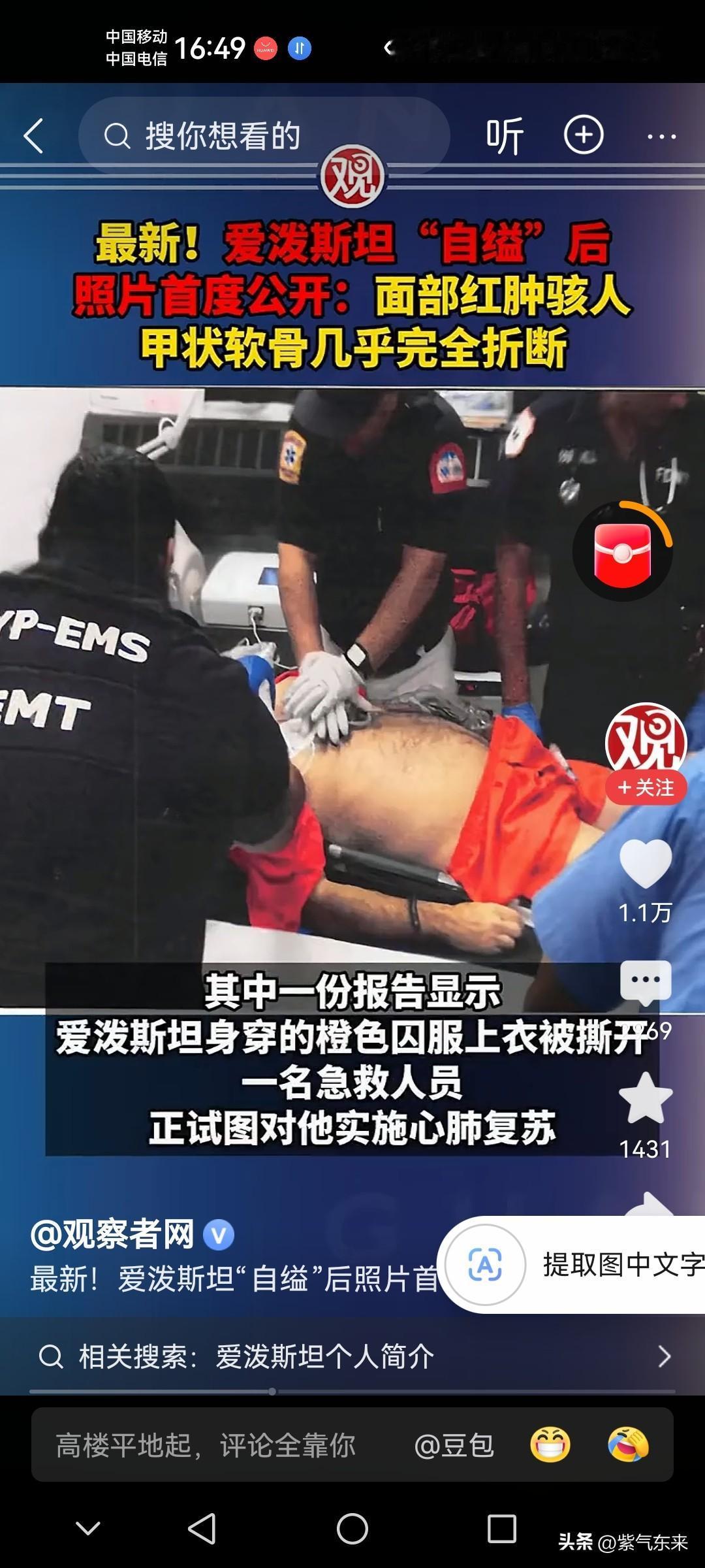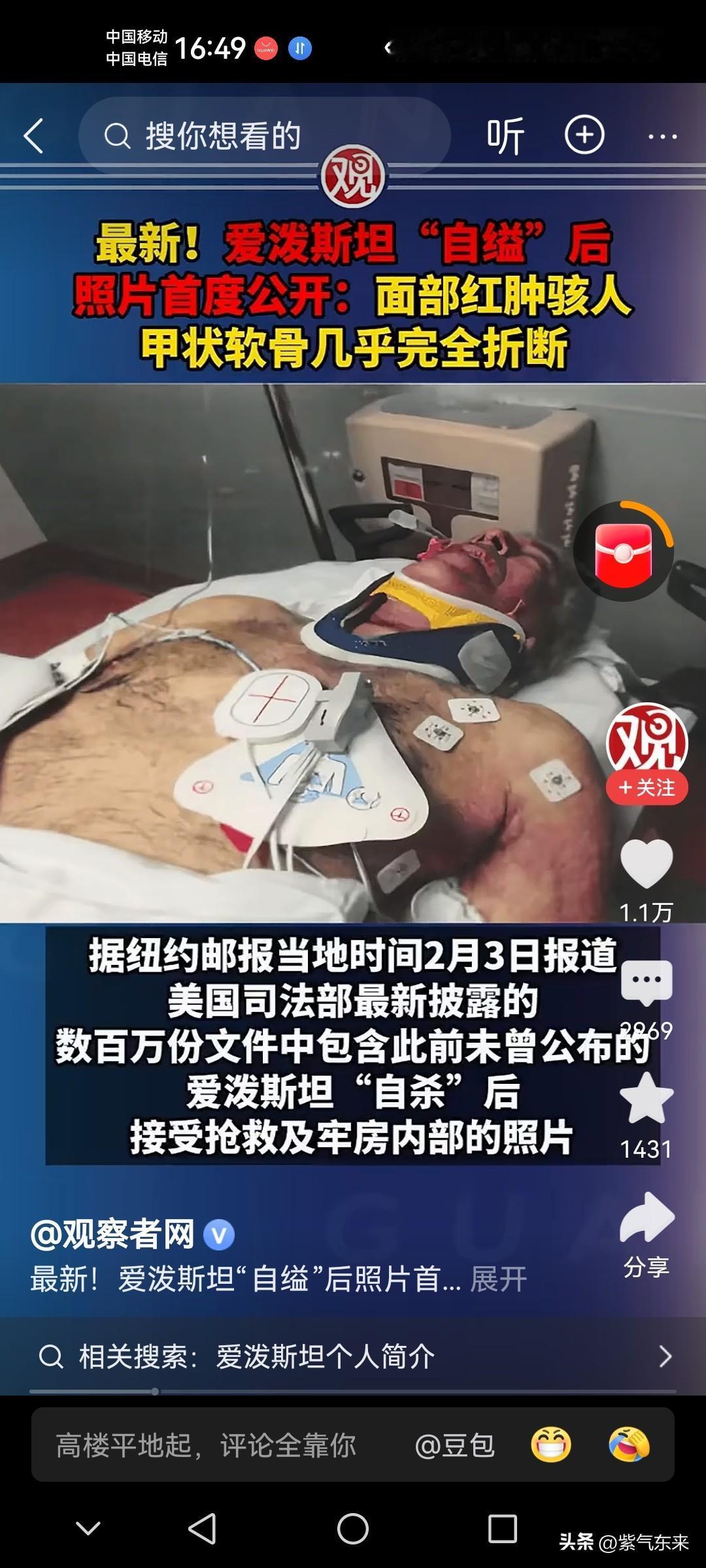 爱泼斯坦明显是“他杀”! 萝莉岛事件让西方政要和富豪颜面扫地 爱泼斯坦知道自己不会有好的下场,索性就自我了结,好让这一事件完满结束!当然这是最好的结局,但是剧情往往不按照剧本去演绎! 随着爱泼斯坦“自杀”抢救的照片流出,让外界不得不怀疑到底是“自杀”还是“他杀”呢! 我个人认为自杀的可能性微乎其微! 随着抢救照片首度公开:面部红肿的不正常,留有深红色的勒痕,甲状软骨几乎完全折断! 这明显不是自杀该有的迹象,反观是受到暴力殴打导致甲状软骨折断,脖子有深深的勒痕,明显是他人所为。这种种迹象表明是他杀! 这是想让爱泼斯坦彻底闭嘴,好让这一事件彻底销声匿迹! 法院定罪需要人证和物证。光有物证肯定不行,这明显是冲着爱泼斯坦本人去的!爱泼斯坦大丑闻 爱泼斯坦性侵案 解封爱泼斯坦案 爱泼斯坦名单门 爱泼斯坦女孩
