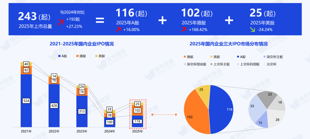 2025年,港股IPO数量达102起,同比增长168.42%,而A股全年IPO数量为116起(基数更大),同比增长12.7%,港股IPO增速表现突出,成为全年退出市场的重要亮点。