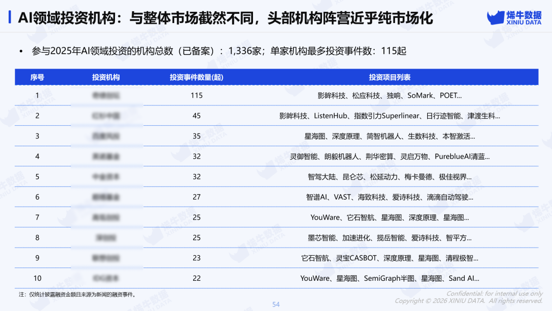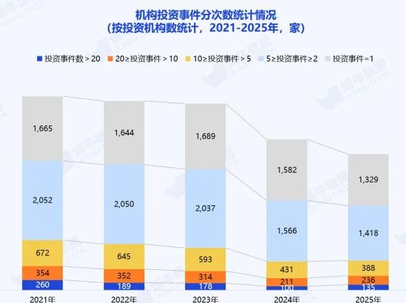2025年,机构的“头部效应”进一步凸显:投资事件超过10起的机构从2024年的311家增至371家,增幅达19.3%;