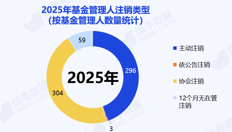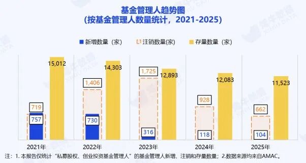 连续五年,私募股权、创业投资基金管理人新增数量都在持续减少,2025年仅新增104家;与此同时,全年管理人注销数量达662家,其中协会注销304家、主动注销296家。