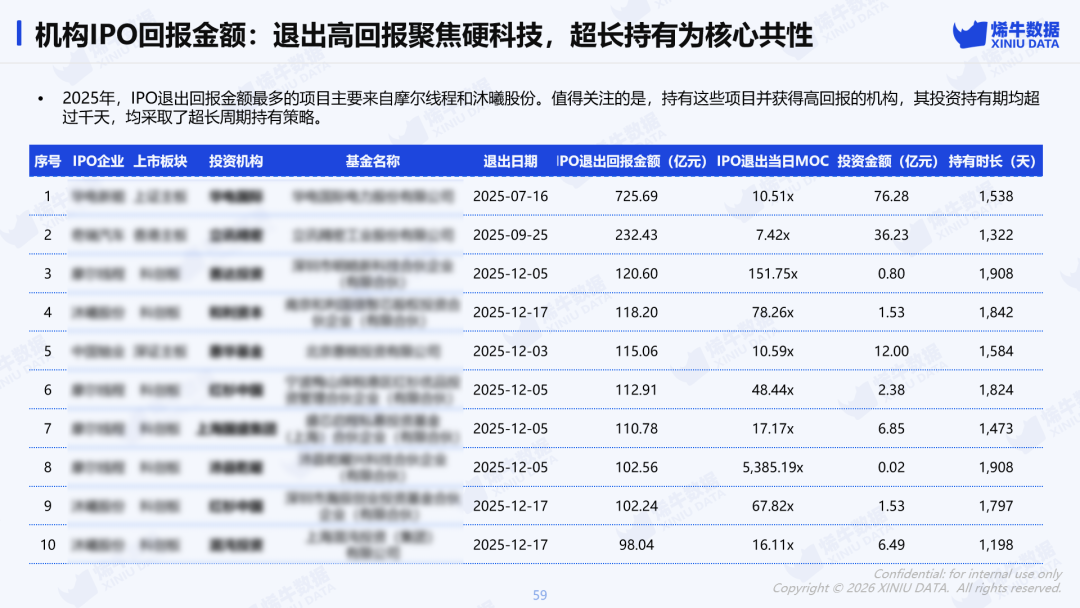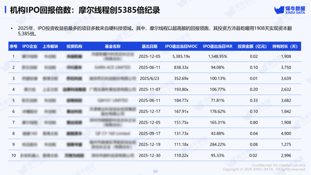 2025年,IPO退出市场的另一个亮点,是硬科技项目的超高回报——其中,摩尔线程的投资方沛县乾曜,用1908天(约5.2年)实现了5385倍的资本回报,成为全年最亮眼的退出案例。