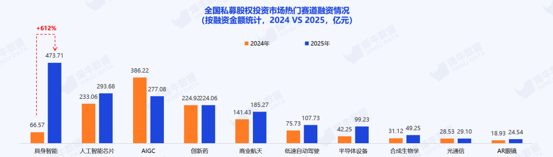 具身智能赛道暴涨6倍:具身智能赛道融资金额从2024年的66.57亿元,飙升至2025年的473.71亿元,同比增幅612%,银河通用机器人、星海图等企业纷纷斩获大额融资。
