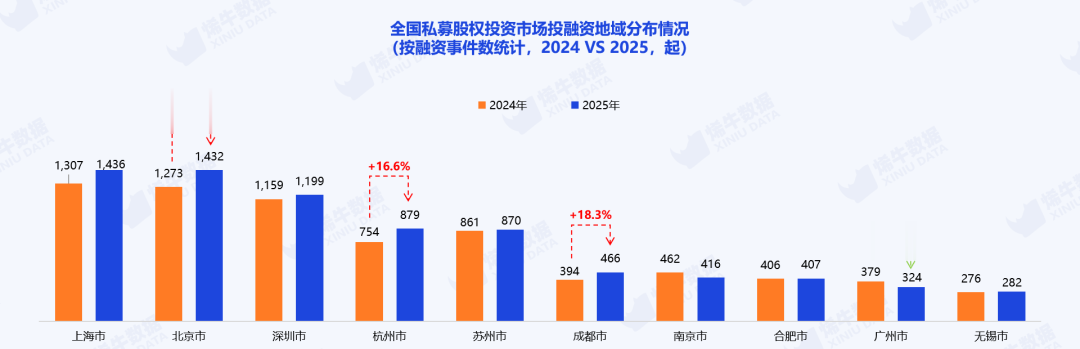 在第二梯队中,杭州表现较为亮眼,融资数量同比增长16.6%,2025年超越苏州跃居第四;成都同比增幅达18.3%,融资数量增至466起,得益于当地对硬科技的政策扶持和人才引入;而广州融资活跃度有所回落,数量同比下降14.5%至324起。