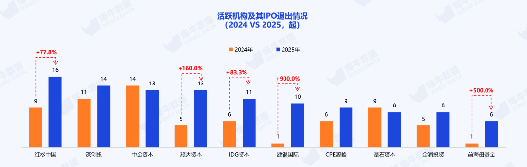 2025年机构IPO退出数量呈现整体增长态势,市场活跃度显著提升。红杉中国以16家IPO退出数量位列第一,同比增长77.8%;深创投、中金资本紧随其后,IPO退出数量分别达到14家和13家。此外,毅达资本、IDG资本、建银国际、前海母基金等机构均实现高倍数增长,分别增长160%、83.3%、900%以及500%。
