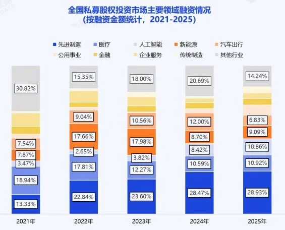 硬科技成绝对锚点:先进制造作为融资体量最大的行业,融资金额占比从2021年的13.33%攀升至2025年的28.93%,主要受益于高端装备、半导体等领域进口替代的迫切需求,以及国家政策的持续倾斜,同时行业商业化落地加速,盈利前景清晰。