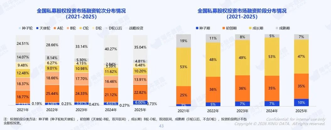 据烯牛数据统计,种子轮、天使轮、A轮,2025年融资金额分别从2024年的12.34亿元、181.17亿元、950.36亿元,回升至34.32亿元、283.73亿元、1,078.11亿元,三者累计合计占比从25.42%增长至29.55%,反弹幅度较为可观。
