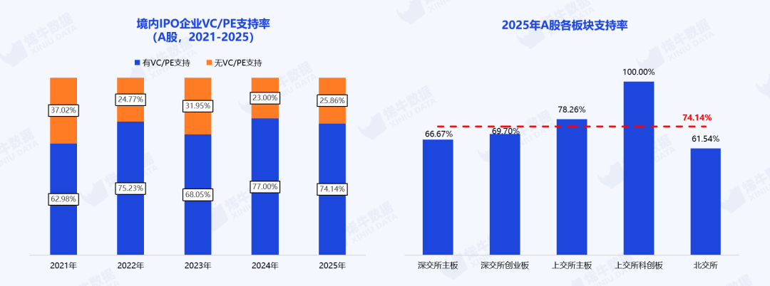 从VC/PE支持IPO渗透率来看,私募股权资本已成为企业上市进程中的关键支撑,渗透率长期维持70%左右的高位区间,2022年起稳定在75%左右的中枢水平,即便2023年受市场调整影响小幅回落至68.05%,2024-2025年仍快速回升并保持稳健,凸显VC/PE在IPO生态中的不可替代性。