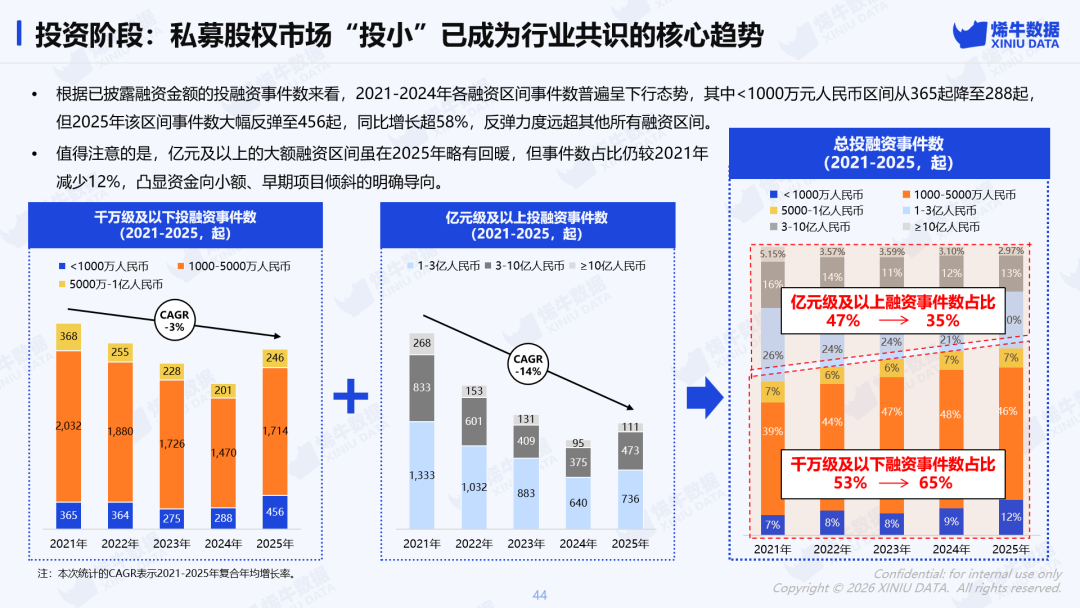 据烯牛数据统计,2025年小于1000万元人民币融资事件数从2024年的288起,大幅反弹至456起,同比增长超58%,反弹力度远超其他融资区间;而亿元及以上大额融资事件数,虽有小幅回暖,但占比仍较2021年减少12%。