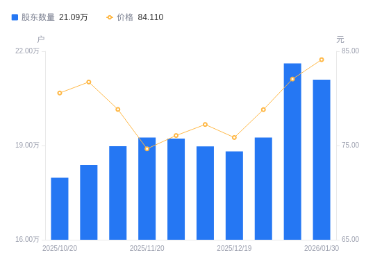 日期A股户数(户)流通A股户均持股数(股)户均持股市值(万元)2026-01-302109474026.9533.872026-01-202161373930.2532.252025-12-311925294412.1834.772025-12-191881304515.3534.252025-12-101897004477.9834.582025-11-281922054419.6233.622025-11-201925404411.9332.942025-11-101897774476.1635.292025-10-311838454620.5937.772025-10-201797644725.4938.07
