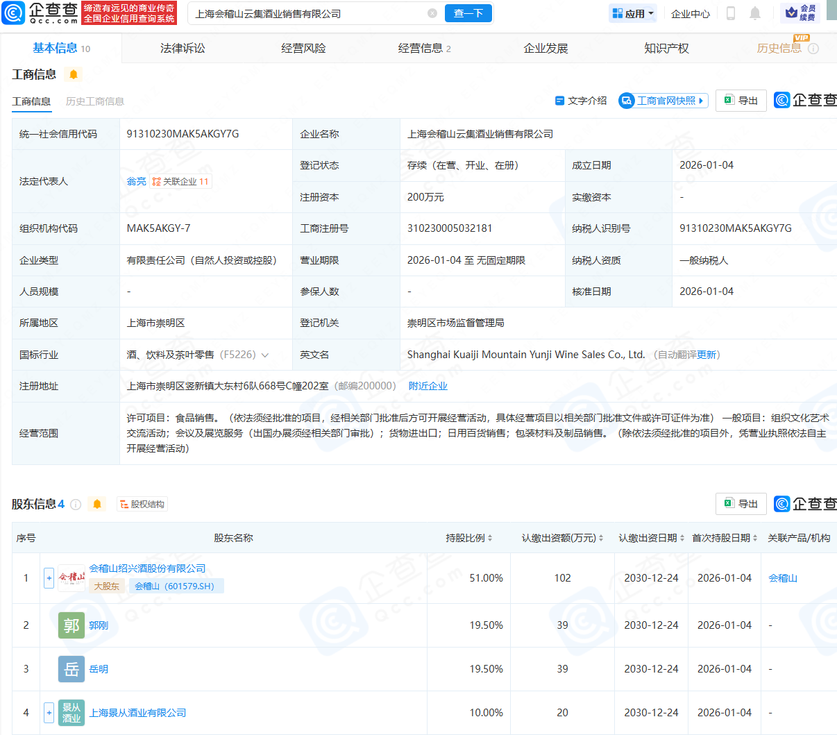 企查查APP显示,近日,上海会稽山云集酒业销售有限公司成立,法定代表人为翁亮,经营范围包含:食品销售;组织文化艺术交流活动;会议及展览服务;日用百货销售;包装材料及制品销售等。企查查股权穿透显示,该公司由会稽山(601579)、郭刚等共同持股。
