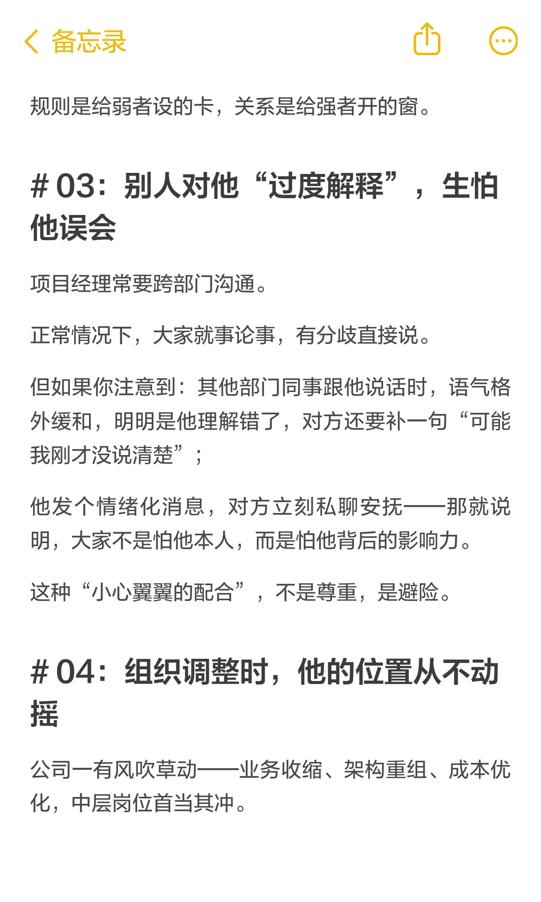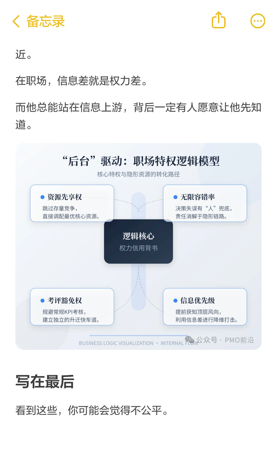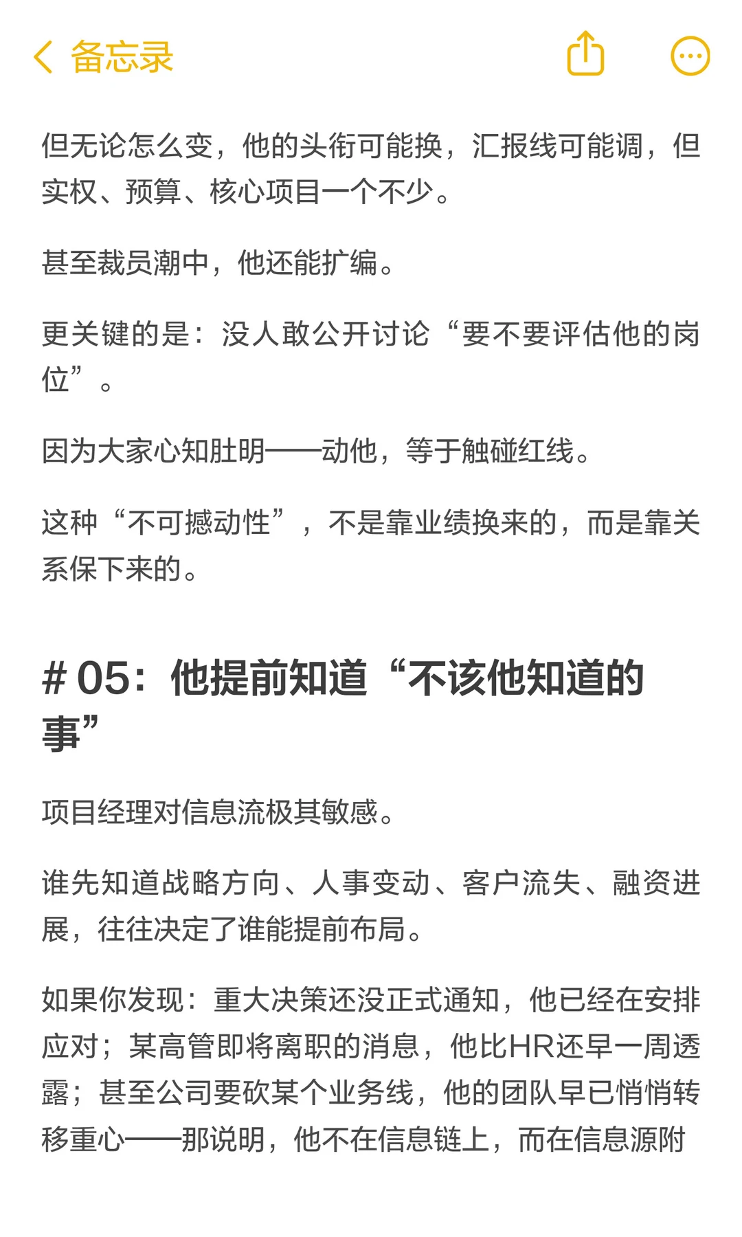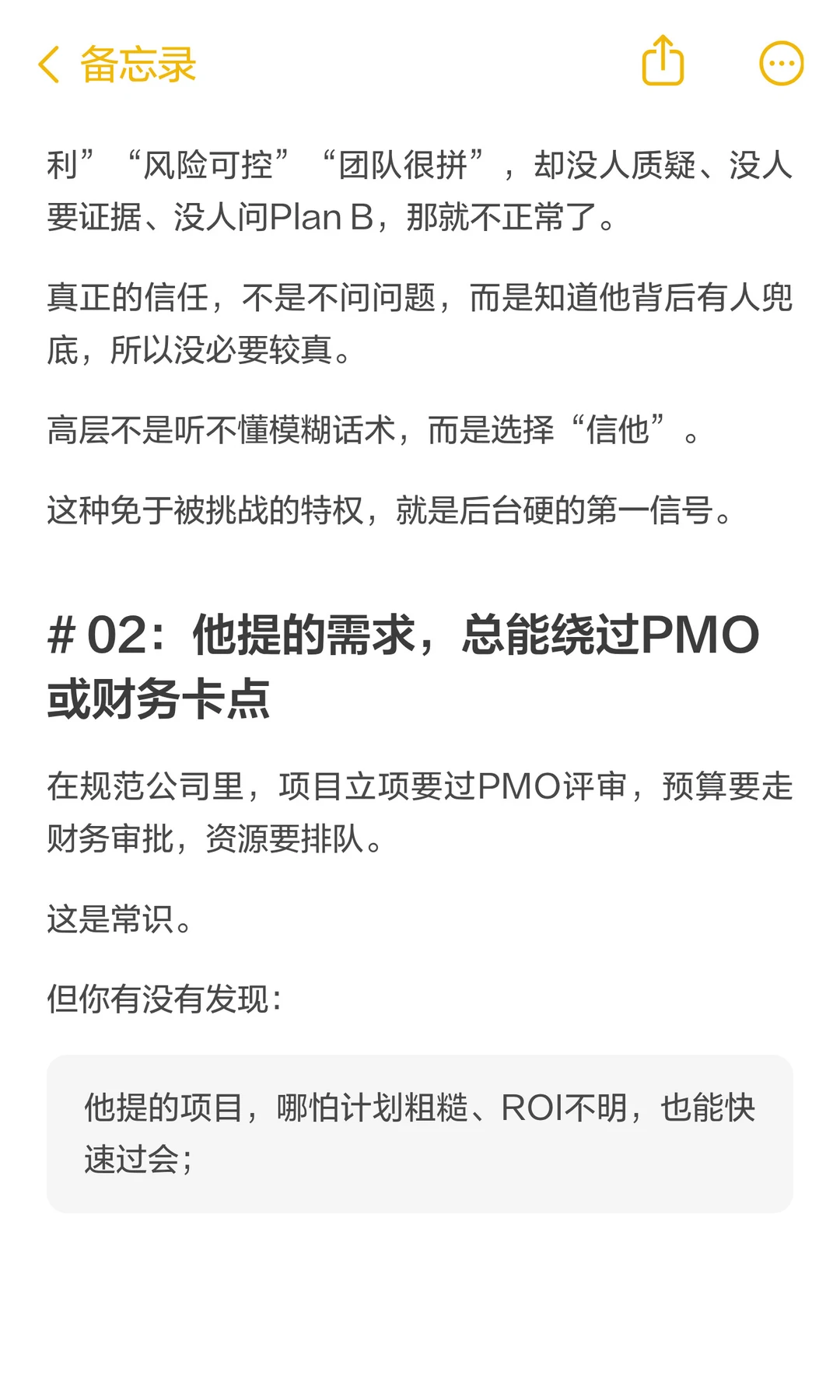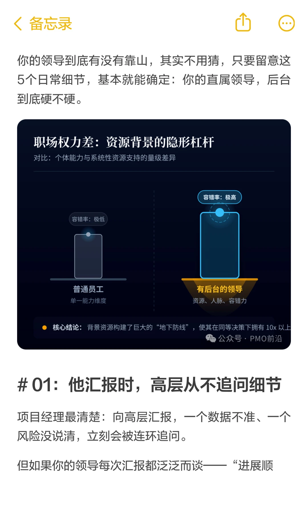 工作久了,你会发现: 有些事和能力无关,和流程无关,甚至和结果都无关——只和“谁罩着他”有关。 而最影响你是否能带好项目的,往往不是客户多难缠,而是你的领导 ——他到底有没有“靠山”,有没有后台! 后台很硬,很多事情解决起来非常简单,是事也不是事了,如果没有后台,有时候不是事也是事! 你了解的你的领导有后台吗?关系硬不硬?