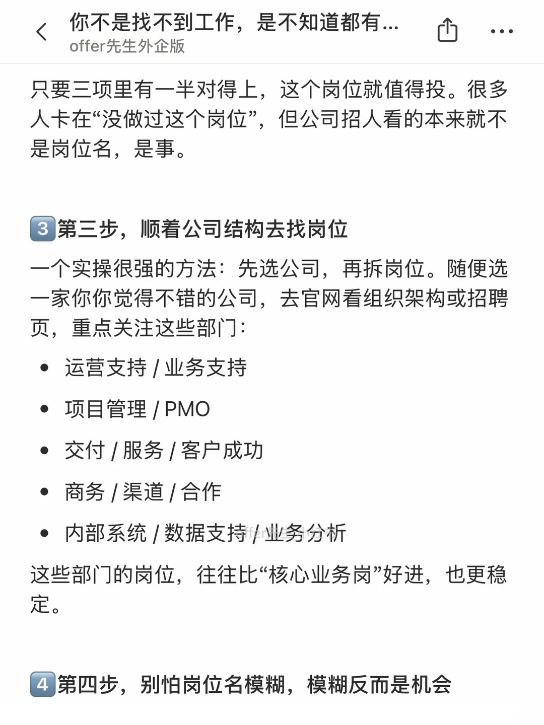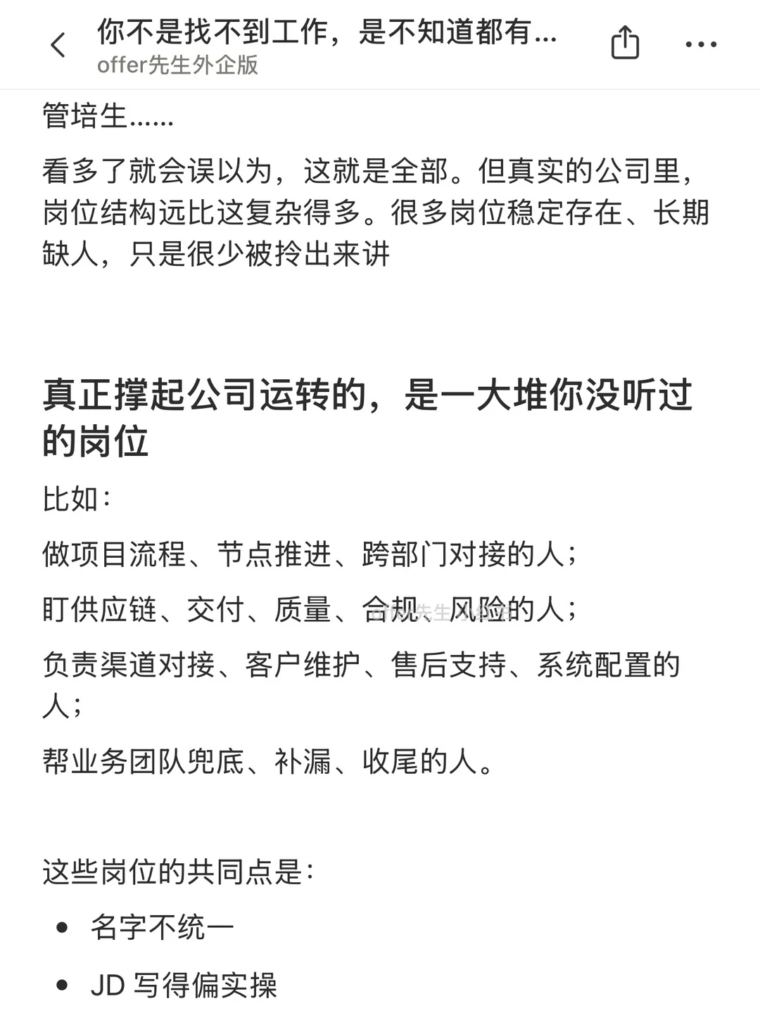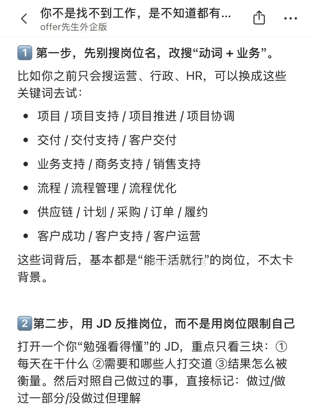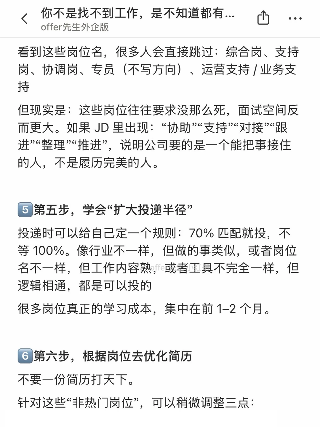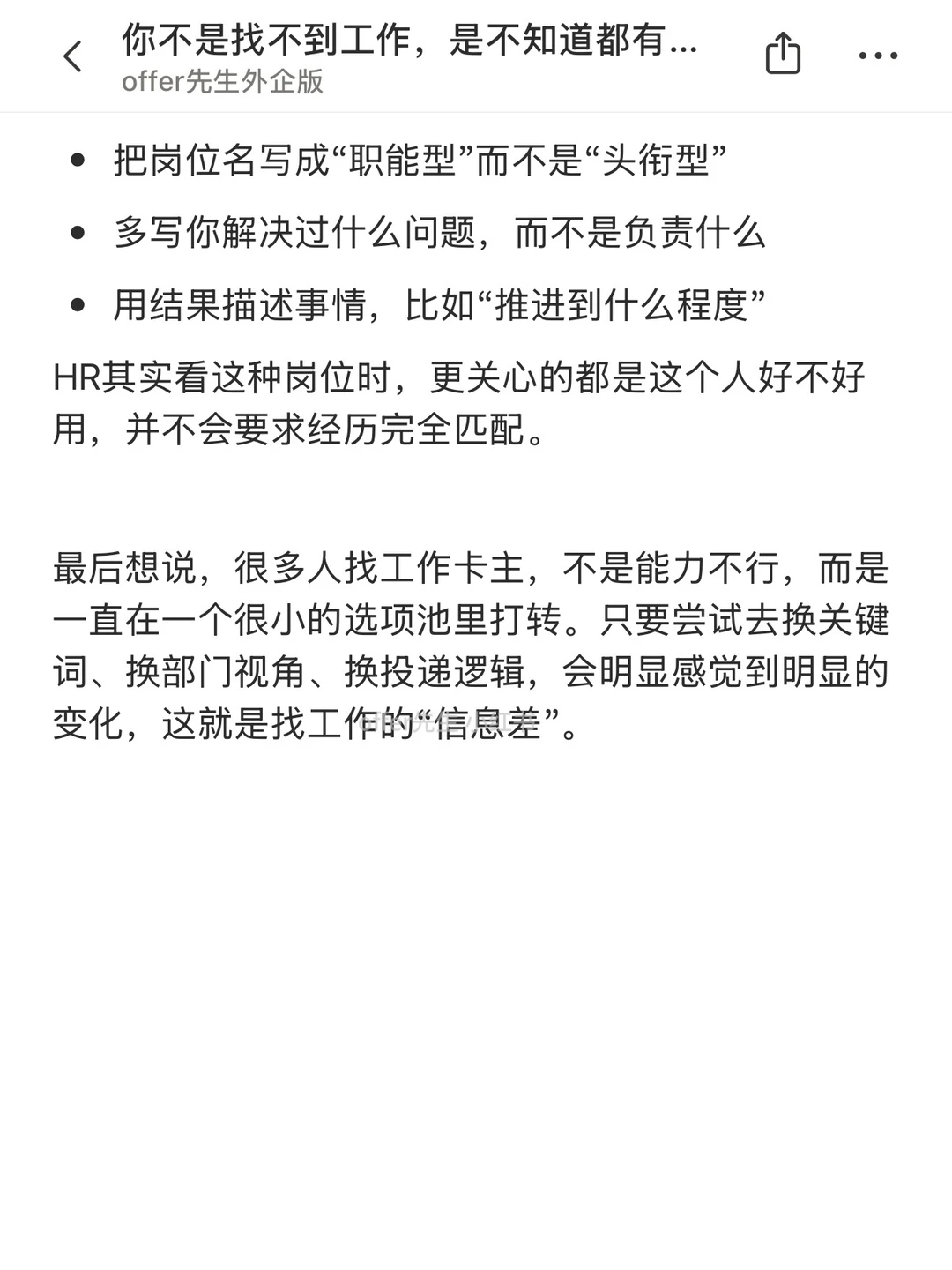 很多人觉得自己“找不到工作”,其实认真拆一下会发现一个很现实的问题:找工作的信息差太大了。 一提找工作,反复盯着那几个熟到不能再熟的岗位刷,刷到怀疑人生,再得出一个结论——市场不行、自己不行。但其实把信息半径拓开一些,会发现机会其实不少。 一个认真分享“找工作”干货的账号。真诚、有料、不说空话,只想用真实经历、具体方法,帮大家少走点弯路