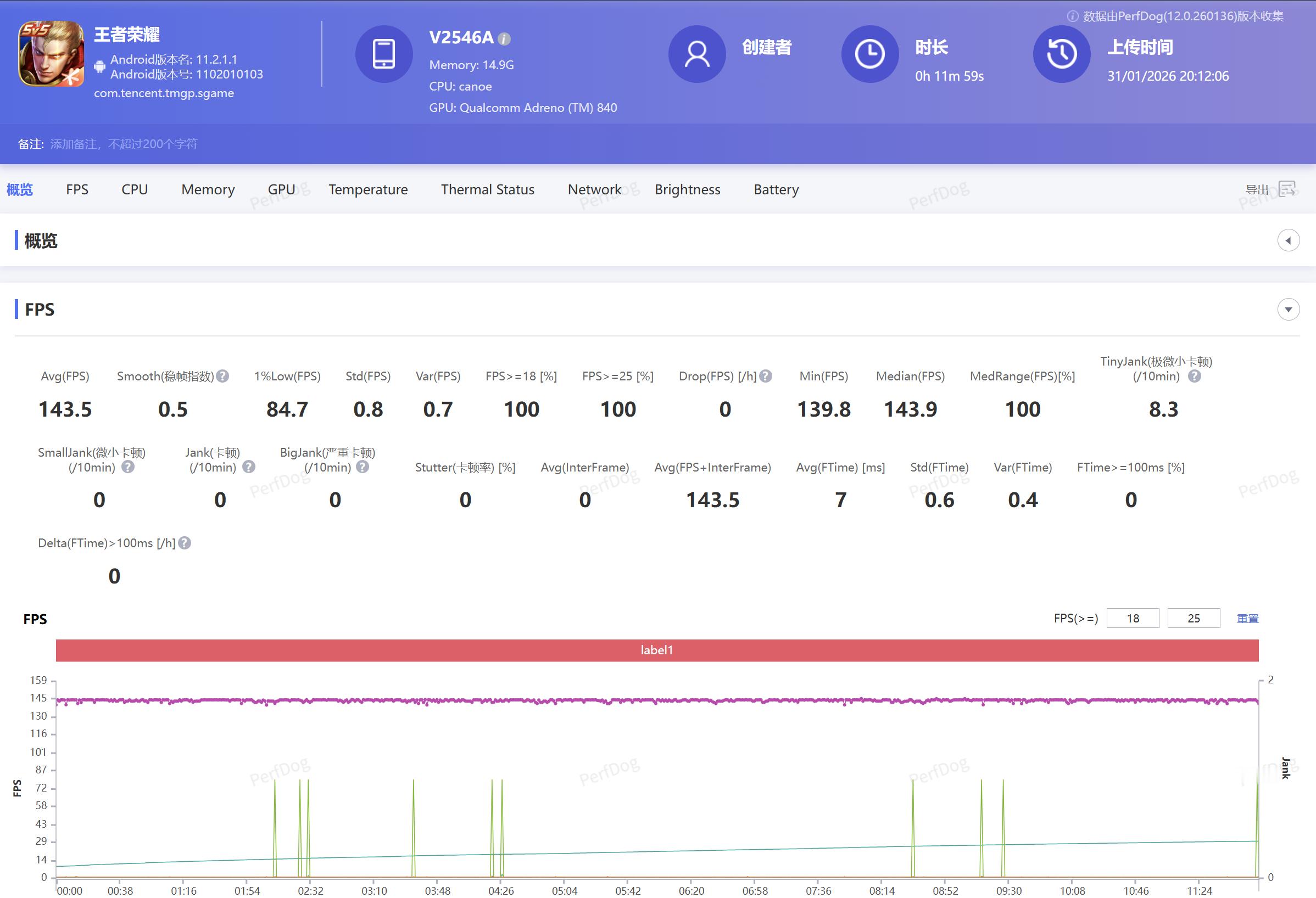 首先是国民手游王者荣耀,iQOO15 Ultra已经完美支持144FPS+极致画质模式。路飞同时把分辨率也开到最高并开启4D游戏振感,单局游戏平均帧率达到143.5帧,无论是清兵线还是集合团战,帧率都稳如一条直线。尤其在开启4D振感之后,释放技能和击杀对方英雄之后的振感反馈都超爽。