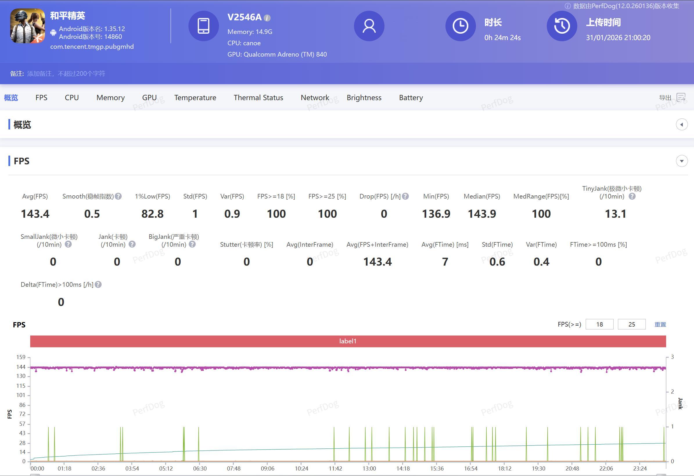 最后是射击类手游和平精英,iQOO15 Ultra这次还专门增加了两个游戏肩键,对于玩这种射击类的游戏真的是如虎添翼,同时还有主动散热风扇的加持,妥妥的物理外挂,冰穹风扇光效也是把仪式感拉满。20多分钟的比赛平均帧率稳定在143.4帧,肩键映射之后四指联动,枪杀对手是从从容容,游刃有余,轻松吃鸡。
