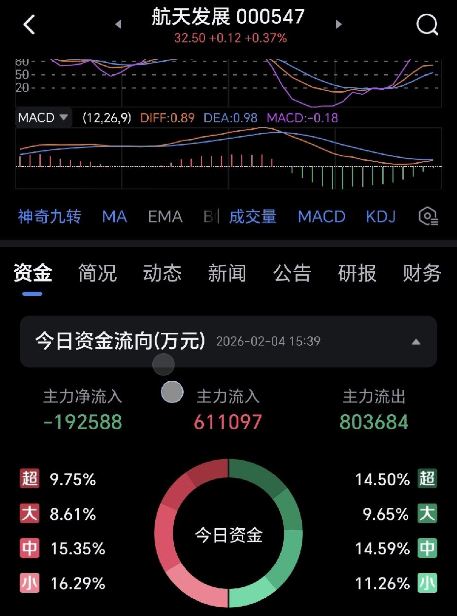 早上进航天发展的,被一锅端! 昨天航天发展涨停,主力流进了20多亿,今天微涨0.37%,资金流出19亿。 估计很多网友都好奇,陈小群有没有逃? 现在的陈小群效应越来越低,像昨天陈小群大力进军航天发展的势头,今天应该是涨停,没想到只是微涨。 今天早上杀进去的,都被一锅端。航空航天板块 航天概念股