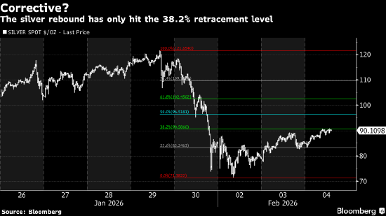 在我职业生涯中,见过最离奇的事情之一就是白银两天内反弹了27%,而这看起来竟然仅仅像是一次回调。只有时间才能告诉我们白银到底能否在未来几周或数月内逆势再创新高。但走势图或许能给我们启发:与此前的跌势相比,自周一低点以来白银的飙升相当温和,这种价格重叠的走势通常是回调的特征。截至发稿时,金价已收复了近期大部分失地,但反弹止步于38.2%回撤位。