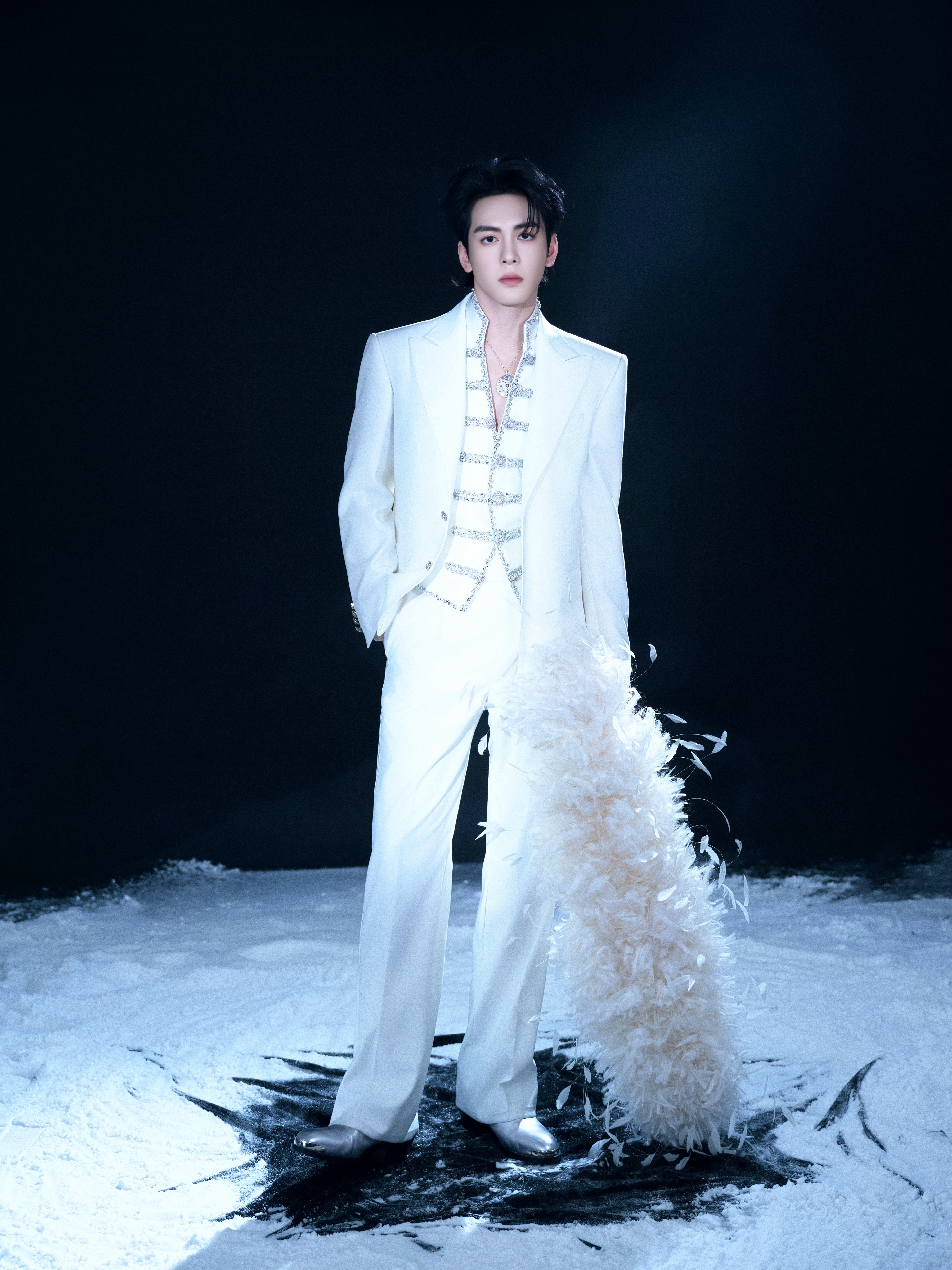 曾舜晞今日出席微博之夜活动造型大片,身着CHENEY CHAN Private特别定制,佩戴全套De Beers戴比尔斯珠宝,白色西装搭配宫廷风马甲和羽毛披肩,贵气而且很有亮点,很帅 ~