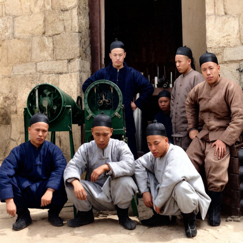 清末时期,天津机器局鱼雷车间门前,几名技术工人和两枚打开弹头的鱼雷合影。 早在1880年代的洋务运动时期,天津机器局便开始仿制黑头鱼雷( Whitehead 鱼雷),因为工业水平落后,生产规模十分有限,在技术方面一直无法摆脱西方的控制。也许正是因为这种原因,蹲在前面的两名男子流露出很沮丧的样子。