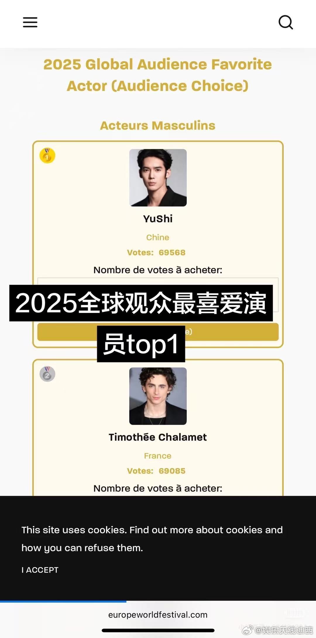 这个奖据说类似于国内百花奖,2025年于适第一。2025年欧洲世界电影节(Europe World Film Festival)“全球观众最喜爱演员(观众选择奖)”于适获得了第一名的成绩。该奖项是2025届欧洲世界电影节新增的“观众选择奖”,由全球观众票选产生。