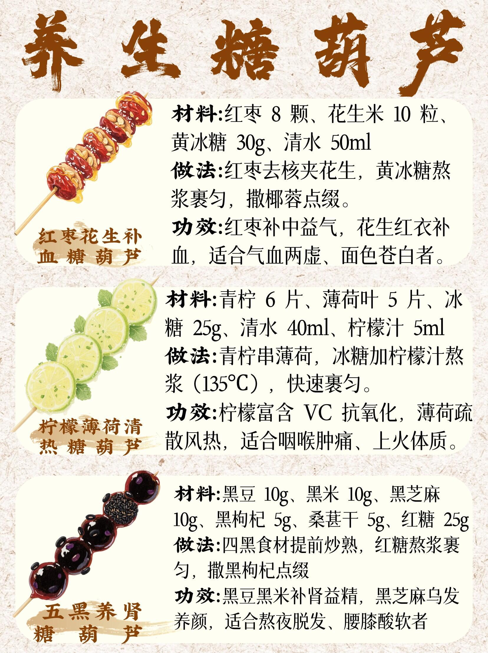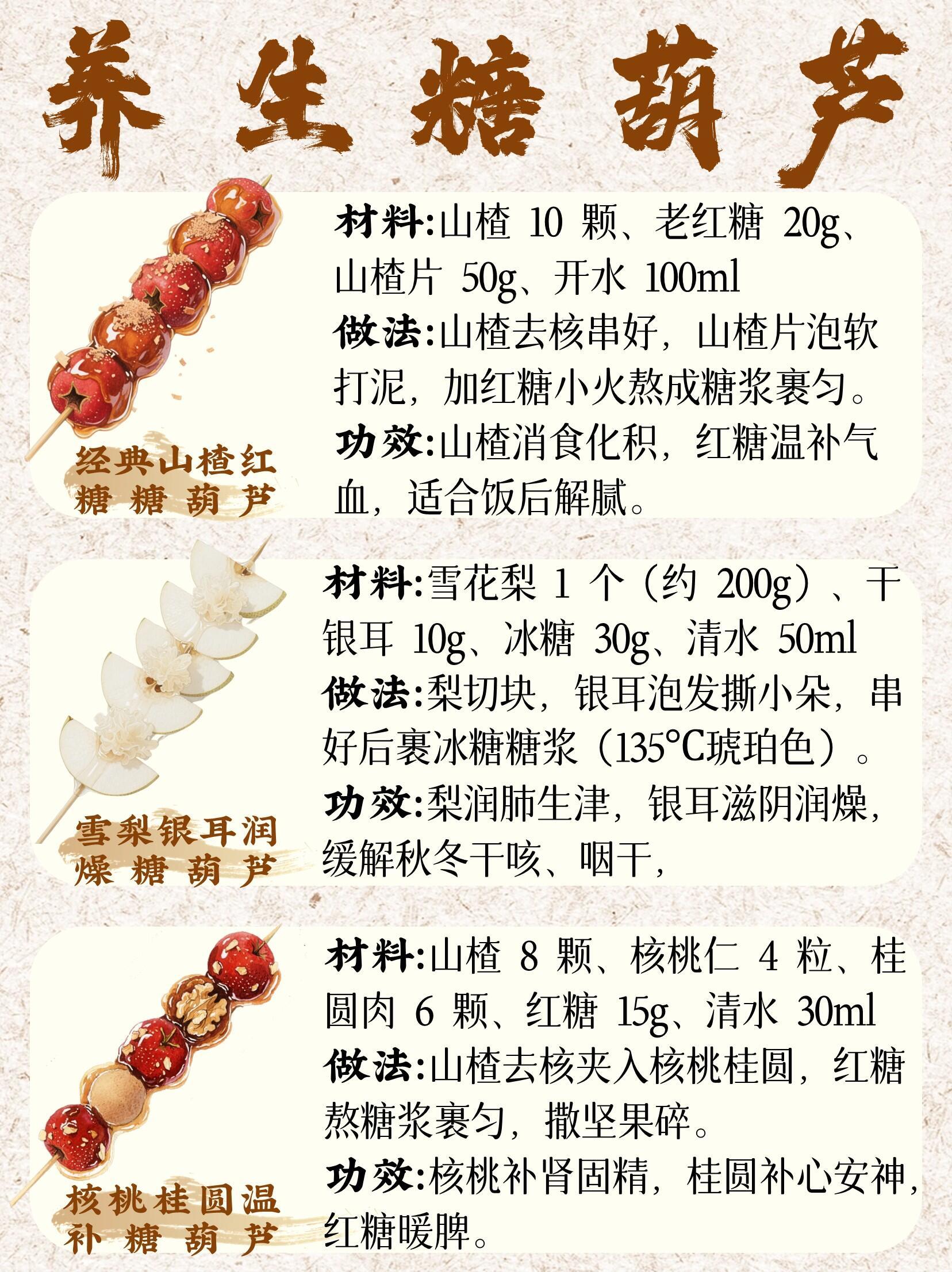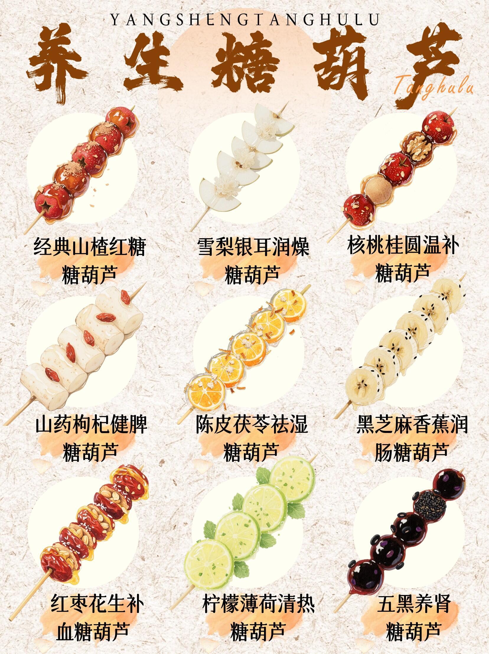 秋冬养生糖葫芦还能这么做:🍡山楂红糖|消食解腻🍐雪梨银耳|润肺滋阴🌰核桃桂圆|补肾安神🍠山药枸杞|健脾养胃🍊陈皮茯苓|祛湿化痰🍌黑芝麻蕉|润肠通便🥜红枣花生|补气养血🍋柠檬薄荷|清热降火⚫五黑养肾|乌发固发春节解腻消食就靠糖葫芦了