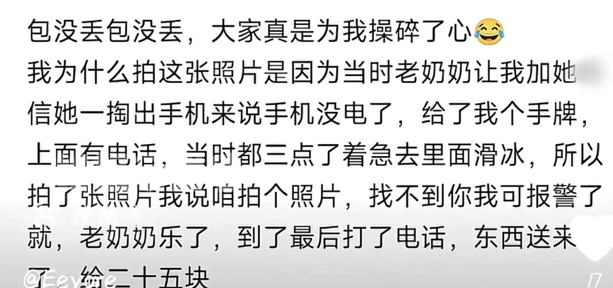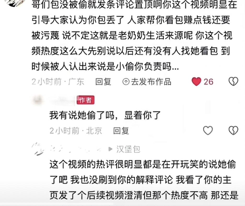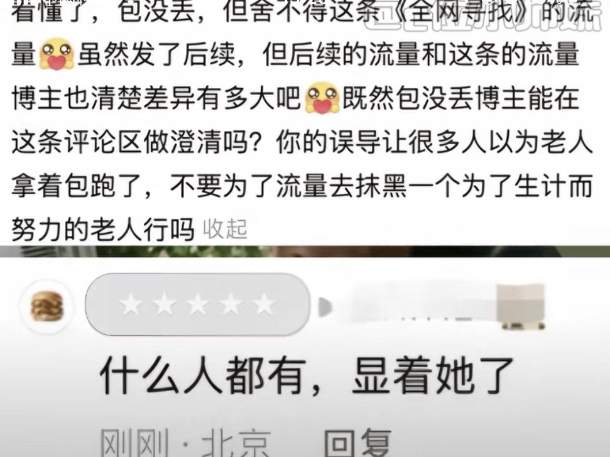 谁说男人没心机,这年头有人为了流量胡乱引导,你的良心真的不会痛吗? 起因一名博主去颐和园游玩找不到存包处,这时候有个老奶奶过来问他需不需要存包,只需要30元。博主同意后又担心到时候找不到老奶奶,于是就拍了张照表示万一到时候找不到还可以拿着这张合照找帽子叔叔帮忙。 但是他拍就拍,偏偏带上"全网寻找"的标签,并且这名博主又特意点赞了一条“2月1号别去颐和园找老奶奶存包”的评论,这一系列操作迅速将视频推上热度,导致许多网友以为老奶奶真的把包拿走没还了。因此评论区充满了对老奶奶的揣测与调侃。 事实上老奶奶并没有拿走他的包,甚至结账时还便宜了5块钱。虽然博主不久后又发了一条视频向网友说明自己的包没丢,但是后面看到原视频热度越来越高,于是火速删掉澄清视频,独独留下那个充满误导的原视频,任由老奶奶继续在网上被网友调侃。 有网友让博主别为了流量抹黑一个为了生计而努力的老人时,结果还被博主回怼到:“什么人都有,显着你了”。 最后许多曾受助于这位奶奶的游客都出来作证,说她是一位极其热心善良的老人,会骑车送客到门口,一路细心介绍,哪里风景好、哪里适合拍照,还再三叮嘱雪天路滑,注意安全。最后这名博主看到风向开始反转了才把视频删除。