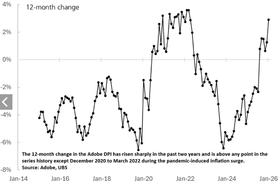 据瑞银(UBS)分析,Adobe数字价格指数(Adobe‘sDigitalPriceIndex)显示,1月份美国在线零售价格的环比涨幅创下该指数12年历史新高。