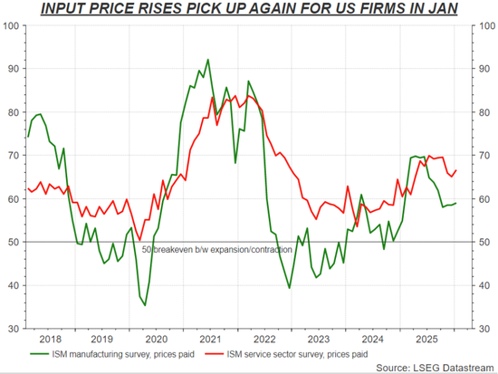 美国供应管理协会(ISM)1月份的制造业和服务业调查显示,“支付价格”指数的增速在上月再度加快。这引发了市场担忧,即这些成本可能会滞后传导至消费者层面。