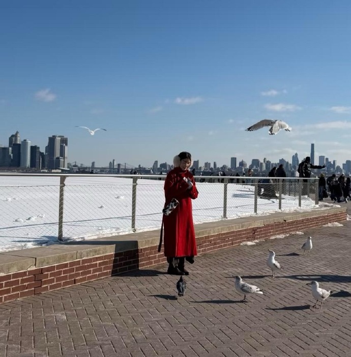 28岁徐娇在美国旅游被偶遇,她穿着红色大衣和长筒皮靴,化着精致的妆容,看起来很贵气,越来越漂亮了!