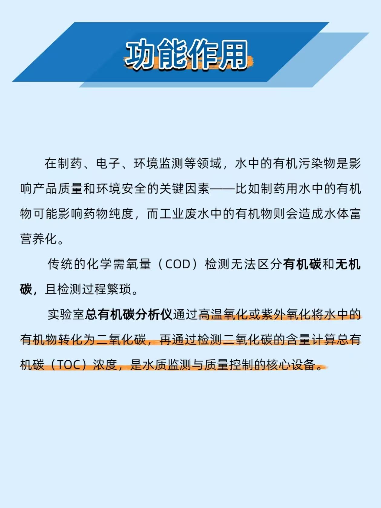 COD 检测等几小时还分不清有机无机碳?这台仪器几分钟精准出结果! 做水质检测,传统 COD 不仅要等几小时,还分不清有机碳和无机碳,结果不准还费试剂!总有机碳(TOC)分析仪才是水质监测的 “精准利器”,几分钟出结果,直接测有机污染物浓度,无二次污染,制药、电子、环保全领域适配! ✨ 核心优势,直接碾压传统检测! 快到离谱:检测仅需几分钟,对比 COD 的几小时,效率直接拉满 精准到极致:检测下限 0.001mg/L,低浓度有机污染物也逃不过 操作躺赢:自动化进样 + 自动处理数据,减少人为误差 环保友好:不用大量化学试剂,无二次污染,符合环保要求 📌 避坑指南,测不准全因踩这些! ❌ 采样容器别乱选:必须用无有机物污染的容器,不然样品直接被污染! ❌ 高浓度样品别硬测:用无有机物纯水稀释,确保在检测范围内! ❌ 悬浮物样品别直接进:先过滤,不然堵住进样系统! ✅ 定期维护别偷懒:清洁进样系统、换氧化剂,不然数据飘到离谱! 不管是制药用水合规检测、电子级超纯水监控,还是工业废水污染评估,这台仪器全拿捏! 你做水质检测时遇过最头疼的问题是什么?评论区唠唠!