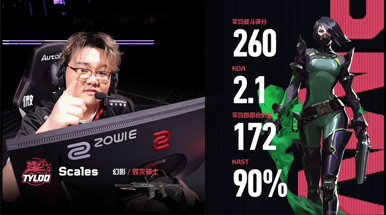 虎扑02月05日讯在刚刚结束的TYL对阵TE的BO3比赛中,260战斗评分172回合均伤,Scales斩获TYL对阵TE图一MVP
