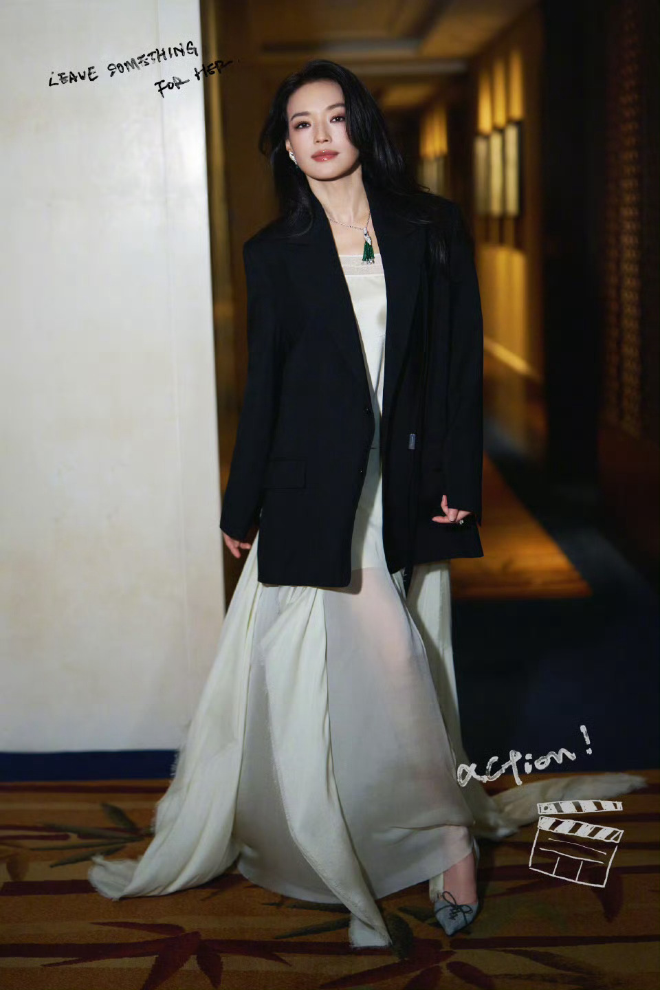 舒淇戴高珠美商在线 舒淇身穿抹胸白裙搭配黑色西装外套亮相微博之夜红毯,以导演身份