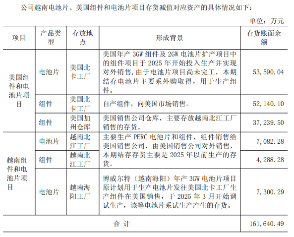 而越南组件和电池片项目中的北江工厂主要生产PERC电池片和组件,组件销售给美国销售公司,由美国销售公司对外销售;博威尔特(越南海阳)年产3GW电池片项目原计划用于生产电池片发往美国北卡工厂生产组件在美国销售,于2025年3月开始调试生产,当年12月决定停止推进。