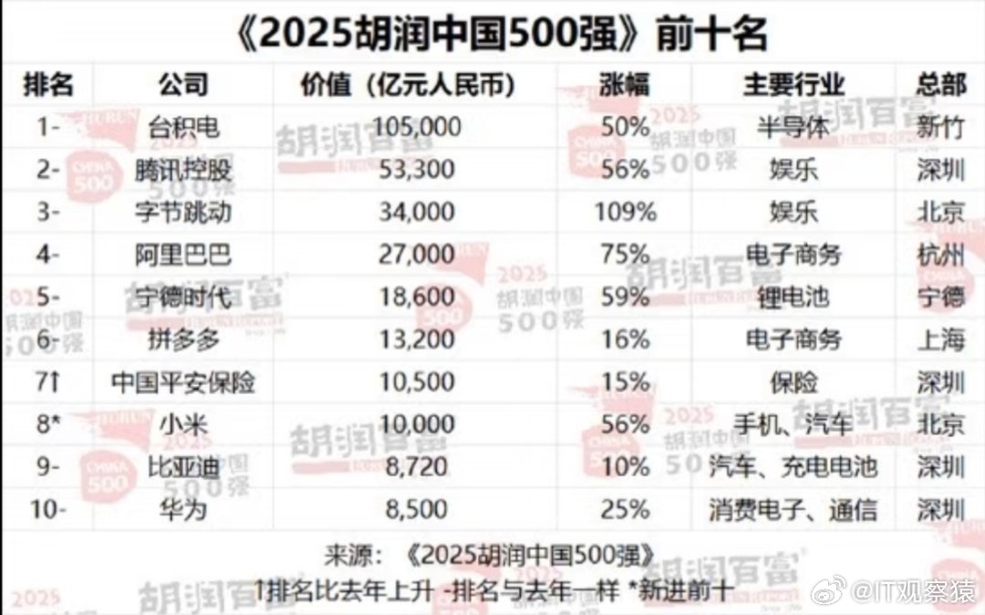 小米首次进入中国500强前十胡润中国500强:台积电第一,小米首进前八。