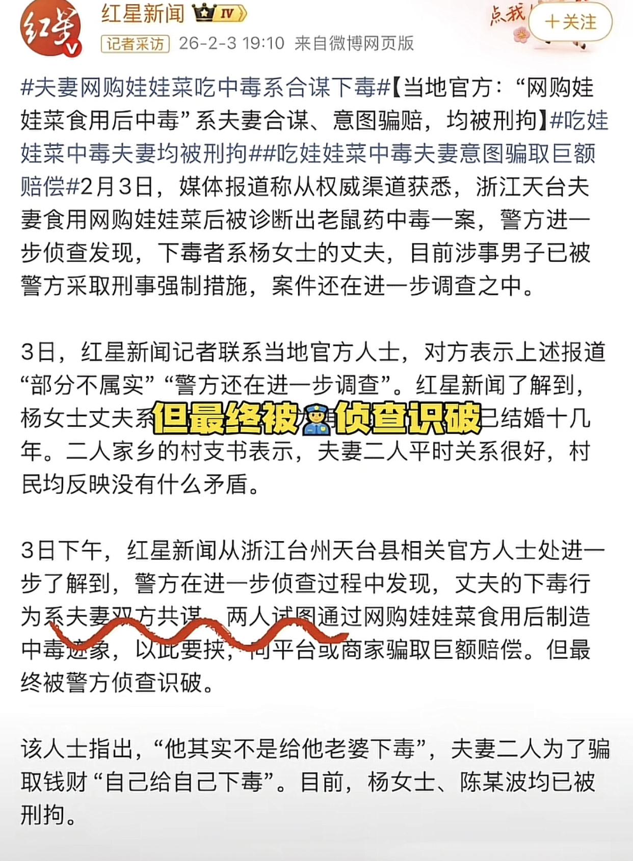 没想到娃娃菜事件再次迎来反转,没想到这年头有人为了钱真敢吃老鼠药啊! 前两天引起广泛讨论的夫妻俩吃了带有老鼠药的娃娃菜中毒事件,最开始帽子叔叔在包裹娃娃菜的旧报纸上发现老鼠药成分,大家以为是商家疏漏,用沾了老鼠药的报纸拿来包装娃娃菜,夫妻俩还找来了记者报道这件事情,镜头前两人委屈的不行,于是大家就以为真的是娃娃菜商家的问题,导致商家的店铺被网友冲的不得不注销。 然而帽子叔叔调查后发现这对夫妻的丈夫在不久前有购买老鼠药的记录,结合采访中丈夫飘忽的眼神,大家又以为是丈夫为了鲨妻做的局,但是帽子叔叔走访了街坊邻居后,得知这对夫妻俩平时关系很好没什么矛盾。 就在大家好奇到底是真相是什么的时候,事件最终迎来了第三种结局,最后帽子叔叔公布的结果是这一切都是夫妻俩自导自演的,想以此向平台或商家索要巨额赔偿。目前两人目前均已被帽子叔叔带回局里。而最倒霉的就是娃娃菜商家了,好好的店铺被他们搞到注销了。