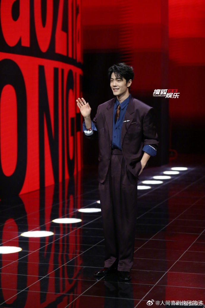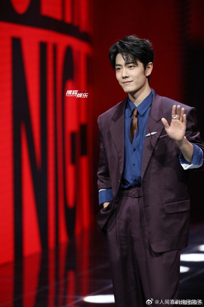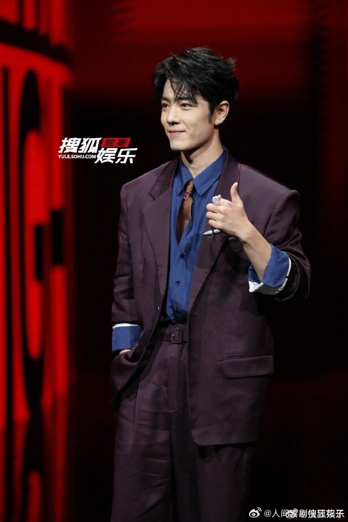 肖战红毯大屏好红肖战红毯现场大屏肖战红毯大屏画面亮眼,深紫西装配蓝衬衫与焦糖领带
