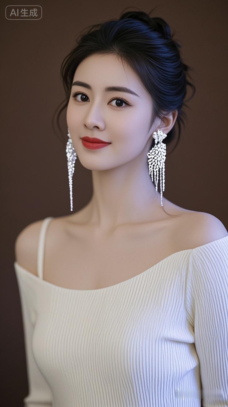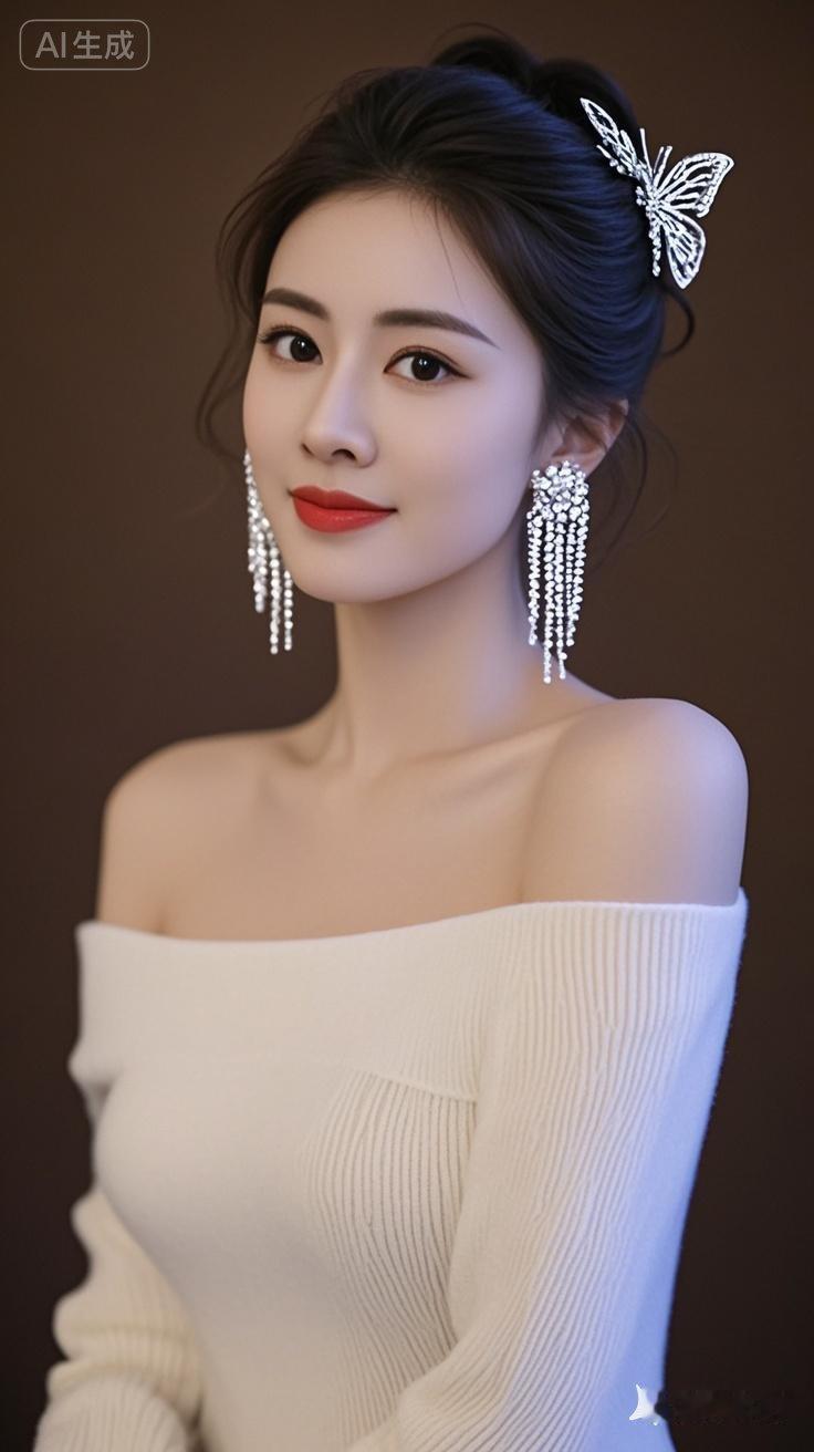 中国美少女,脸颊瘦小,绝色佳人,卷翘的睫毛,面部冷白皮;盘发,微乱,发间点缀白钻饰;,身着白色高领露肩毛衣,左耳是银色水晶蝴蝶造型耳环,右耳为多层水晶流苏耳坠;深棕背景,光线聚焦于人物,美丽,高贵,优雅,甜美,温柔